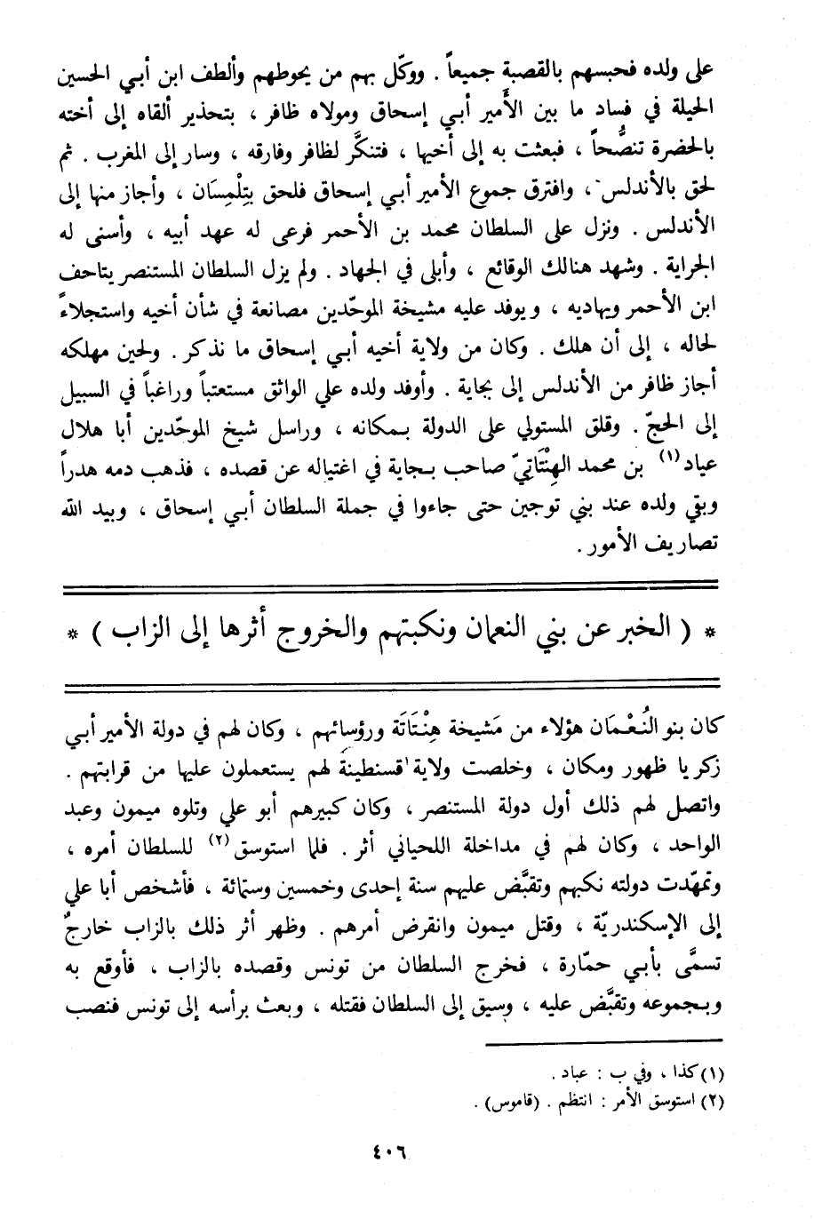 واتصل لهم ذلك أول دولة المستنصر، وكان كبيرهم أبو علي وتلوه ميمون وعبد الواحد، وكان لهم في مداخلة اللحياني أثر. فلما استوسق [2] للسلطان أمره، وتمهّدت دولته نكبهم وتقبّض عليهم سنة إحدى وخمسين وستمائة، فأشخص أبا علي إلى الإسكندريّة، وقتل ميمون وانقرض أمرهم. وظهر أثر ذلك بالزاب خارج تسمّى بأبي حمّارة، فخرج السلطان من تونس وقصده بالزاب، فأوقع به وبجموعه وتقبّض عليه، وسيق إلى السلطان فقتله، وبعث برأسه إلى تونس فنصب