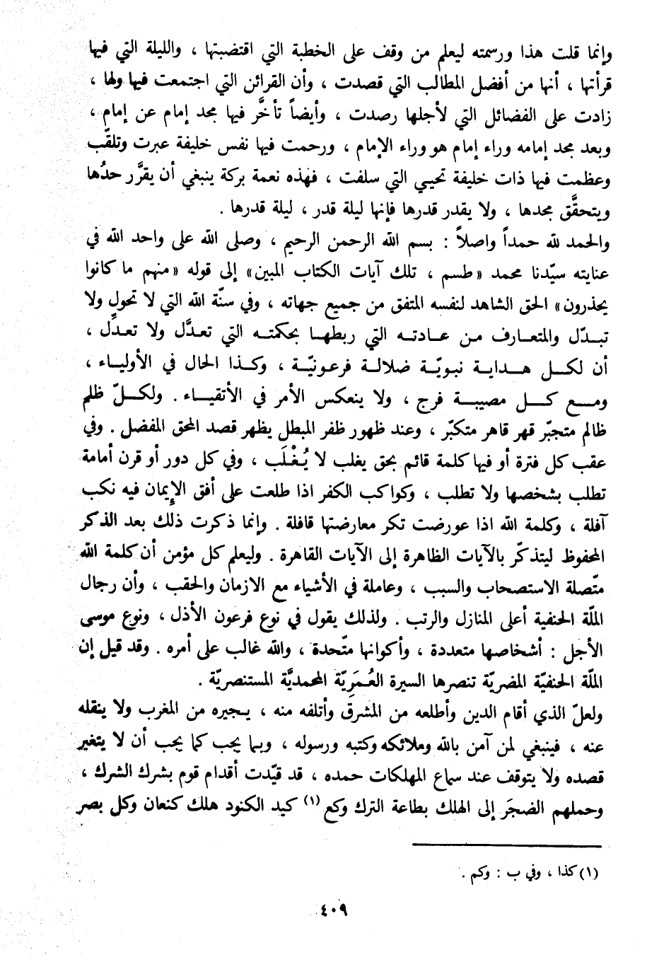 والحمد للَّه حمدا وأصلا: بِسْمِ الله الرَّحْمنِ الرَّحِيمِ 1: 1، وصلى الله على واحد الله في عنايته سيّدنا محمد طسم، تِلْكَ آياتُ الْكِتابِ الْمُبِينِ 28: 1- 2 إلى قوله مِنْهُمْ ما كانُوا يَحْذَرُونَ 28: 6 الحق الشاهد لنفسه المتفق من جميع جهاته، وفي سنّة الله التي لا تحول ولا تبدّل والمتعارف من عادته التي ربطها بحكمته التي تعدّل ولا تعدّل، أن لكل هداية نبويّة ضلالة فرعونيّة، وكذا الحال في الأولياء، ومع كل مصيبة فرج، ولا ينعكس الأمر في الأتقياء. ولكلّ ظلم ظالم متجبّر قهر قاهر متكبّر، وعند ظهور ظفر المبطل يظهر قصد المحق المفضل. وفي عقب كل فترة أو فيها كلمة قائم بحق يغلب لا يغلب، وفي كل دور أو قرن أمامة تطلب بشخصها ولا تطلب، وكواكب الكفر إذا طلعت على أفق الإيمان فيه نكب آفلة، وكلمة الله إذا عورضت تكر معارضتها قافلة. وإنما ذكرت ذلك بعد الذكر المحفوظ ليتذكّر بالآيات الظاهرة إلى الآيات القاهرة. وليعلم كل مؤمن أن كلمة الله متّصلة الاستصحاب والسبب، وعاملة في الأشياء مع الأزمان والحقب، وأن رجال الملّة الحنفية أعلى المنازل والرتب. ولذلك يقول في نوع فرعون الأذل، ونوع موسى الأجل: أشخاصها متعددة، وأكوانها متّحدة، والله غالب على أمره. وقد قيل إن الملّة الحنفيّة المضريّة تنصرها السيرة العمريّة المحمديّة المستنصريّة.