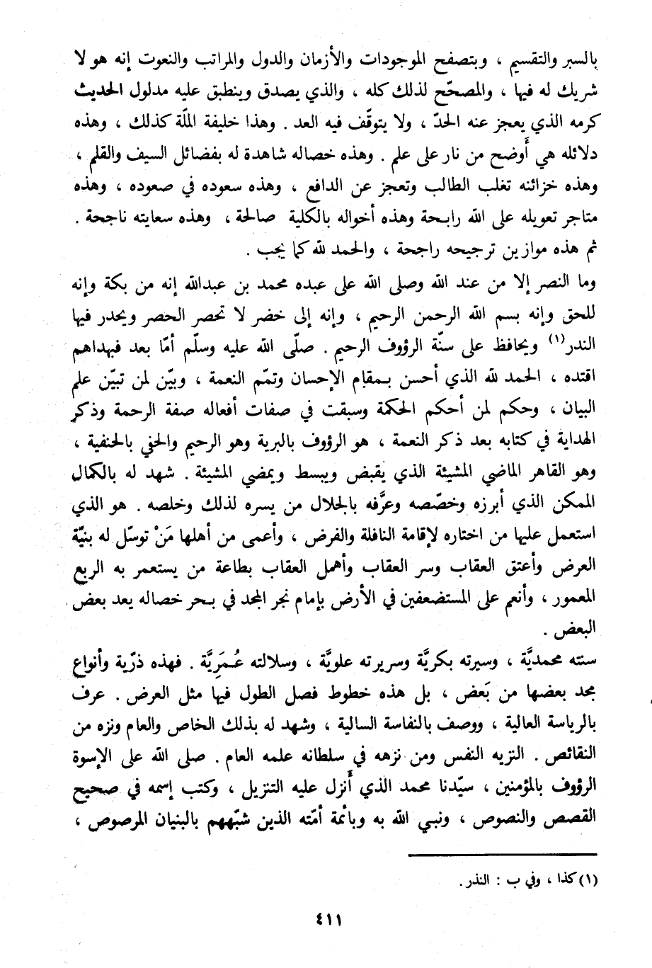 وما النصر إلا من عند الله وصلى الله على عبده محمد بن عبد الله إنه من بكة وإنه للحق وإنه بِسْمِ الله الرَّحْمنِ الرَّحِيمِ 1: 1، وإنه إلى خضر لا تحصر الحصر ويحدر فيها الندر [1] ويحافظ على سنّة الرؤوف الرحيم. صلّى الله عليه وسلّم أمّا بعد فبهداهم اقتده، الحمد للَّه الّذي أحسن بمقام الإحسان وتمّم النعمة، وبيّن لمن تبيّن علم البيان، وحكم لمن أحكم الحكمة وسبقت في صفات أفعاله صفة الرحمة وذكر الهداية في كتابه بعد ذكر النعمة، هو الرؤوف بالبرية وهو الرحيم والحفي بالحنفية، وهو القاهر الماضي المشيئة الّذي يقبض ويبسط ويمضي المشيئة. شهد له بالكمال الممكن الّذي أبرزه وخصّصه وعرّفه بالجلال من يسره لذلك وخلصه. هو الّذي استعمل عليها من اختاره لإقامة النافلة والفرض، وأعمى من أهلها من توسّل له بنيّة العرض وأعتق العقاب وسر العقاب وأهمل العقاب بطاعة من يستعمر به الربع المعمور، وأنعم على المستضعفين في الأرض بإمام نجر المجد في بحر خصاله يعد بعض البعض.