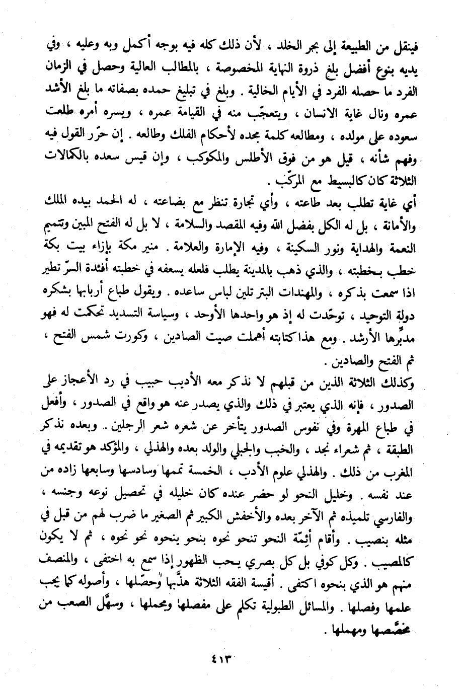 فينقل من الطبيعة إلى بحر الخلد، لأن ذلك كله فيه بوجه أكمل وبه وعليه، وفي يديه بنوع أفضل بلغ ذروة النهاية المخصوصة، بالمطالب العالية وحصل في الزمان الفرد ما حصله الفرد في الأيام الخالية. وبلغ في تبليغ حمده بصفاته ما بلغ الأشد عمره ونال غاية الإنسان، ويتعجّب منه في القيامة عمره، ويسره أمره طلعت سعوده على مولده، ومطالعه كلمة مجده لأحكام الفلك وطالعة. إن حرّر القول فيه وفهم شأنه، قيل هو من فوق الأطلس والمكوكب، وإن قيس سعده بالكمالات الثلاثة كان كالبسيط مع المركّب.