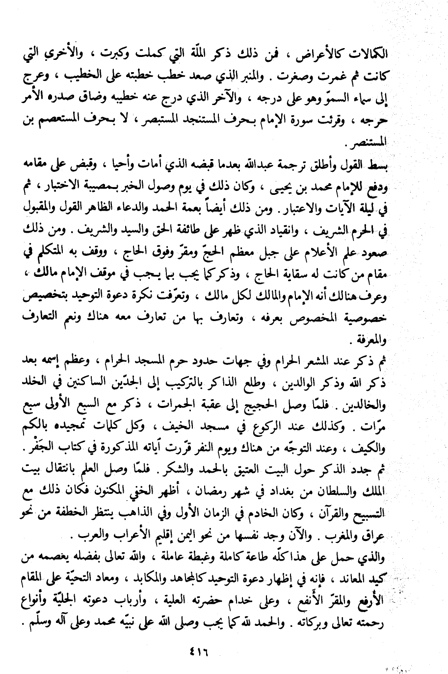 بسط القول وأطلق ترجمة عبد الله بعد ما قبضه الّذي أمات وأحيا، وقبض على مقامه ودفع للإمام محمد بن يحيى، وكان ذلك في يوم وصول الخبر بمصيبة الاختبار، ثم في ليلة الآيات والاعتبار. ومن ذلك أيضا بعمة الحمد والدعاء الظاهر القول والمقبول في الحرم الشريف، وانقياد الّذي ظهر على طائفة الحق والسيد والشريف. ومن ذلك صعود علم الأعلام على جبل معظم الحجّ ومقرّ وفوق الحاج، ووقف به المتكلم في مقام من كانت له سقاية الحاج، وذكر كما يجب بما يجب في موقف الإمام مالك، وعرف هنالك أنه الإمام والمالك لكل مالك، وتعرّفت نكرة دعوة التوحيد بتخصيص خصوصية المخصوص بعرفة، وتعارف بها من تعارف معه هناك ونعم التعارف والمعرفة.