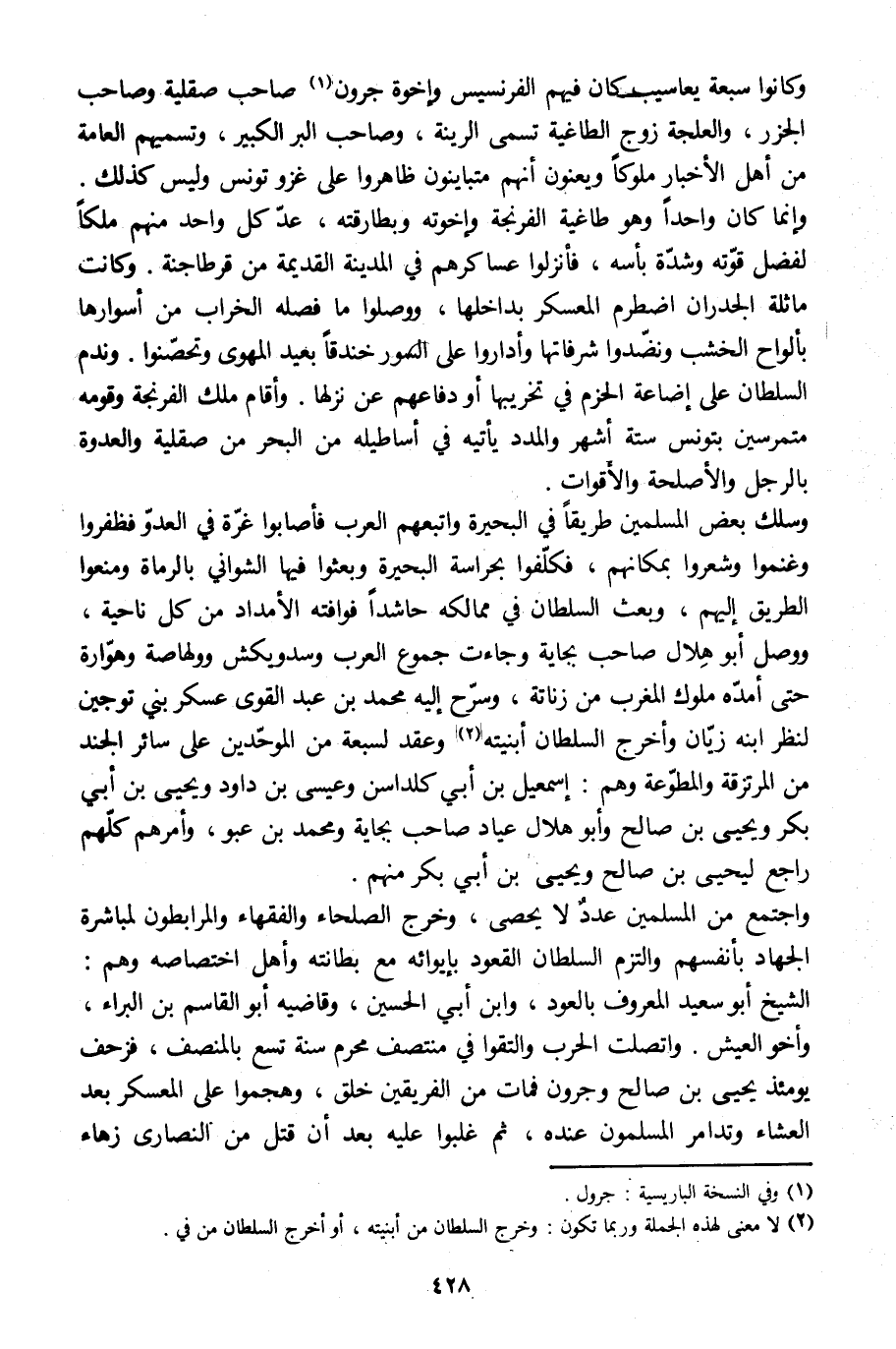 وإنما كان واحدا وهو طاغية الفرنجة وإخوته وبطارقته، عدّ كل واحد منهم ملكا لفضل قوّته وشدّة بأسه، فأنزلوا عساكرهم في المدينة القديمة من قرطاجنة. وكانت ماثلة الجدران اضطرم المعسكر بداخلها، ووصلوا ما فصله الخراب من أسوارها بألواح الخشب ونضّدوا شرفاتها وأداروا على السور خندقا بعيد المهوى وتحصّنوا. وندم السلطان على إضاعة الحزم في تخريبها أو دفاعهم عن نزلها. وأقام ملك الفرنجة وقومه متمرسين بتونس ستة أشهر والمدد يأتيه في أساطيله من البحر من صقلّيّة والعدوة بالرجل والأصلحة والأقوات.