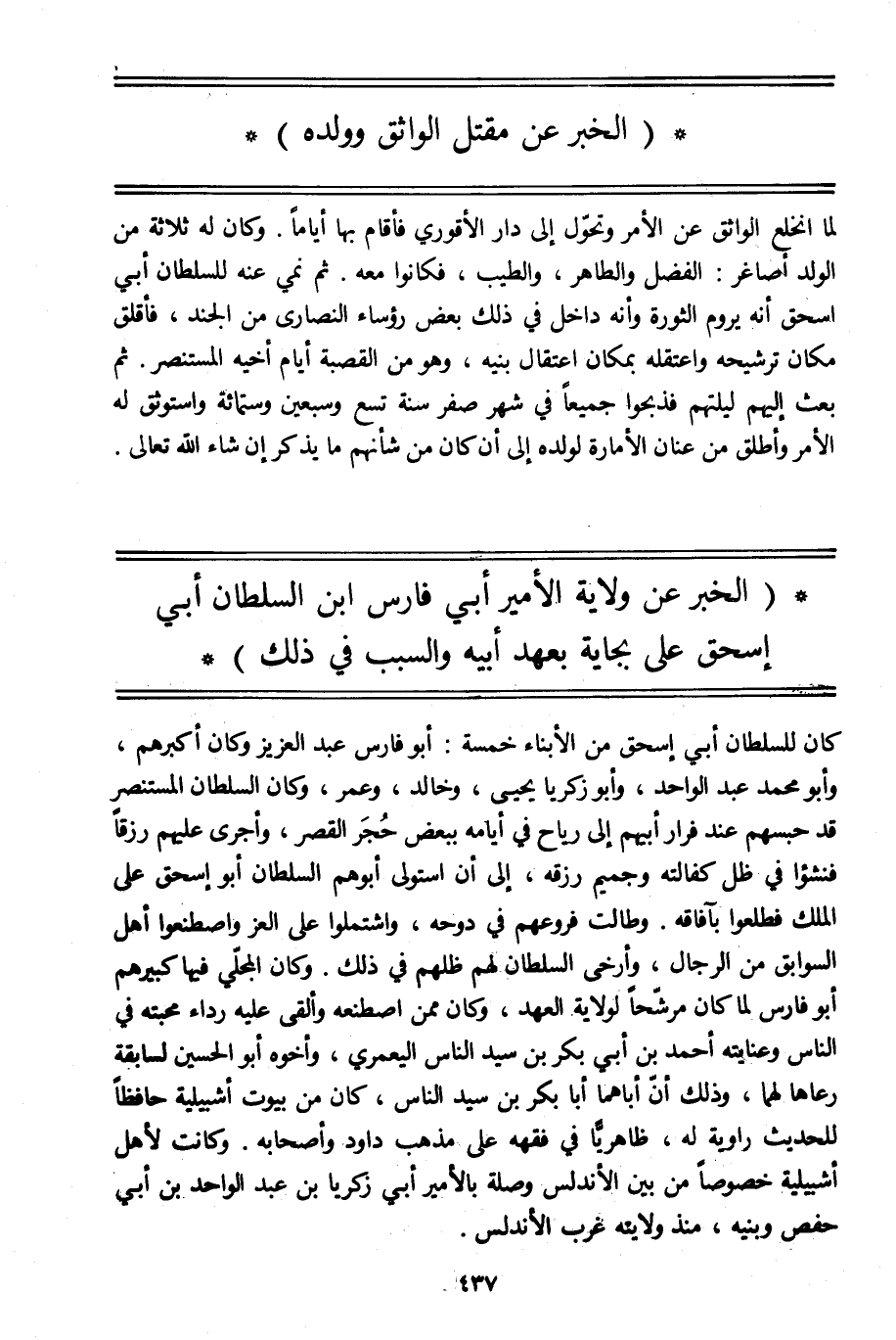 لما انخلع الواثق عن الأمر وتحوّل إلى دار الأقوري فأقام بها أياما. وكان له ثلاثة من الولد أصاغر: الفضل والطاهر، والطيب، فكانوا معه. ثم نمي عنه للسلطان أبي إسحاق أنه يروم الثورة وأنه داخل في ذلك بعض رؤساء النصارى من الجند، فأقلق مكان ترشيحه واعتقله بمكان اعتقال بنيه، وهو من القصبة أيام أخيه المستنصر. ثم بعث إليهم ليلتهم فذبحوا جميعا في شهر صفر سنة تسع وسبعين وستمائة واستوثق له الأمر وأطلق من عنان الإمارة لولده إلى أن كان من شأنهم ما يذكر إن شاء الله تعالى.
