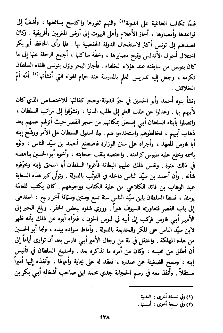 ونشأ بنوه أحمد وأبو الحسين في جوّ الدولة وحجر كفالتها للاختصاص الّذي كان لأبيهم بها. وعدلوا عن طلب العلم إلى طلب الدنيا، وتشوّقوا إلى مراتب السلطان، واتصلوا بأبناء السلطان أبي إسحاق بمكانهم من حجر القصر حيث أنزلهم عمهم بعد ذهاب أبيهم، فخالطوهم واستخدموا لهم. ولما استولى السلطان على الأمر ورشّح ابنه أبا فارس للعهد، وأجراه على سنن الوزارة فاصطنع أحمد بن سيّد الناس، ونوّه باسمه وخلع عليه ملبوس كرامته. واختصه بلقب حجابته، وأخوه أبو الحسين يناهضه في ذلك عنوة. ونفس ذلك عليهما البطانة فأغروا السلطان أبا إسحاق بابنه وخوّفوه شأنه. وأن أحمد بن سيّد الناس داخله في التوثّب بالدولة. وتولّى كبر هذه السعاية عبد الوهاب بن قائد الكلاعي من علية الكتاب ووجوههم. كان يكتب للعامّة يومئذ، فسطا السلطان بابن سيّد الناس سنة تسع وستين وستمائة آخر ربيع، استدعى إلى باب القصر فتعاورته السيوف هبرا. ووري شلوه ببعض الحفر. وبلغ الخبر إلى الأمير أبي فارس فركب إلى أبيه في لبوس الحزن، فعزّاه أبوه عن ذلك بأنه ظهر لابن سيّد الناس على المكر والخديعة بالدولة. وأماط سواده بيده، ونجا أبو الحسين من هذه المهلكة. واعتقل في لمة من رجال الأمير أبي فارس بعد أن توارى أياما إلى أن أطلق من محبسه، وكان من أمره ما نذكره بعد. واستبلغ السلطان في تأنيس ابنه، ومسح الضغينة عن صدره، فعقد له على بجاية وأعمالها، وأنفذه إليها أميرا مستقلا. وأنفذ معه في رسم الحجابة جدي محمد ابن صاحب أشغاله أبي بكر بن