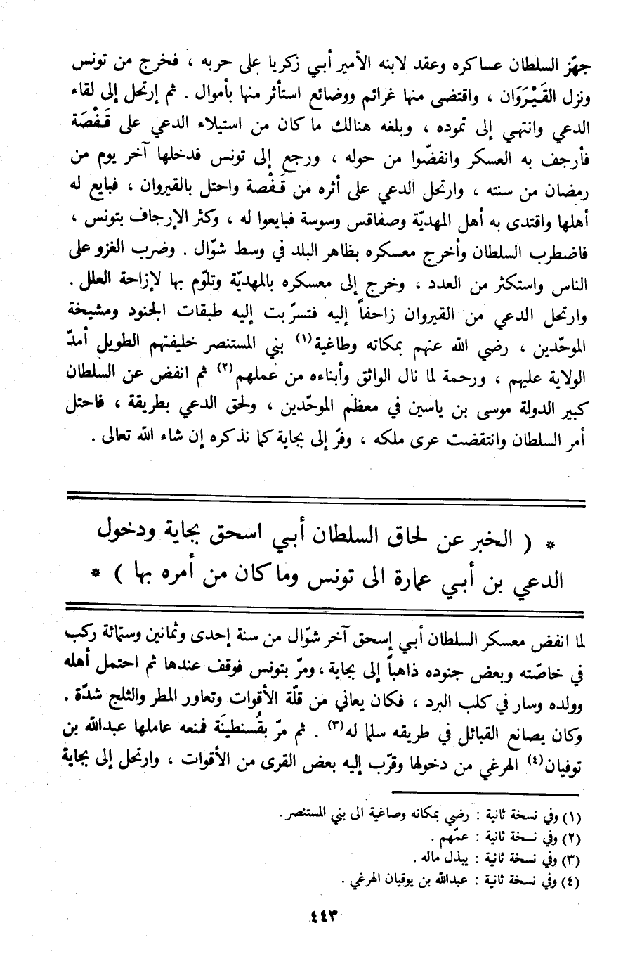وارتحل الدعي من القيروان زاحفا إليه فتسرّبت إليه طبقات الجنود ومشيخة الموحّدين، رضي الله عنهم بمكانه وطاغية [1] بني المستنصر خليفتهم الطويل أمدّ الولاية عليهم، ورحمة لما نال الواثق وأبناءه من عملهم [2] ثم انفض عن السلطان كبير الدولة موسى بن ياسين في معظم الموحّدين، ولحق الدعي بطريقة، فاحتل أمر السلطان وانتقضت عرى ملكه، وفرّ إلى بجاية كما نذكره إن شاء الله تعالى.