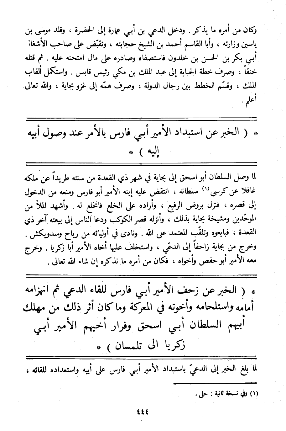 (الخبر عن زحف الأمير أبي افرس للقاء الدعي ثم انهزامه أمامه واستلحامه وإخوته في المعركة وما كان أثر ذلك من مهلك أبيهم السلطان أبي إسحاق وفرار أخيهم الأمير أبي زكريا الى تلمسان)
