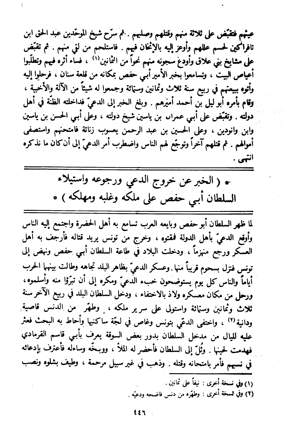 عيثهم فتقبّض على ثلاثة منهم وقتلهم وصلبهم. ثم سرّح شيخ الموحّدين عبد الحق تافراكين لحسن عللهم وأوعز إليه بالإثخان فيهم. فاستلحم من لقي منهم. ثم تقبّض على مشايخ بني علاق وأودع سجونه منهم نحوا من الثمانين [1] ، فساء أثره فيهم وتطلّبوا أعياص البيت، وتسامعوا بخبر الأمير أبي حفص بمكانه من قلعة سنان، فرحلوا إليه وأتوه ببيعتهم في ربيع سنة ثلاث وثمانين وستمائة وجمعوا له شيئا من الآلة والأخبية، وقام بأمره أبو ليل بن أحمد أميرهم. وبلغ الخبر إلى الدعيّ فداخلته الظنّة في أهل دولته. وتقبّض على أبي عمران بن ياسين شيخ دولته، وعلى أبي الحسن بن ياسين وابن وانودين، وعلى الحسين بن عبد الرحمن يعسوب زناتة فامتحنهم واستصفى أموالهم. ثم قتلهم آخرا وتوجّع لهم الناس واضطرب أمر الدعيّ إلى أن كان ما نذكره انتهى.