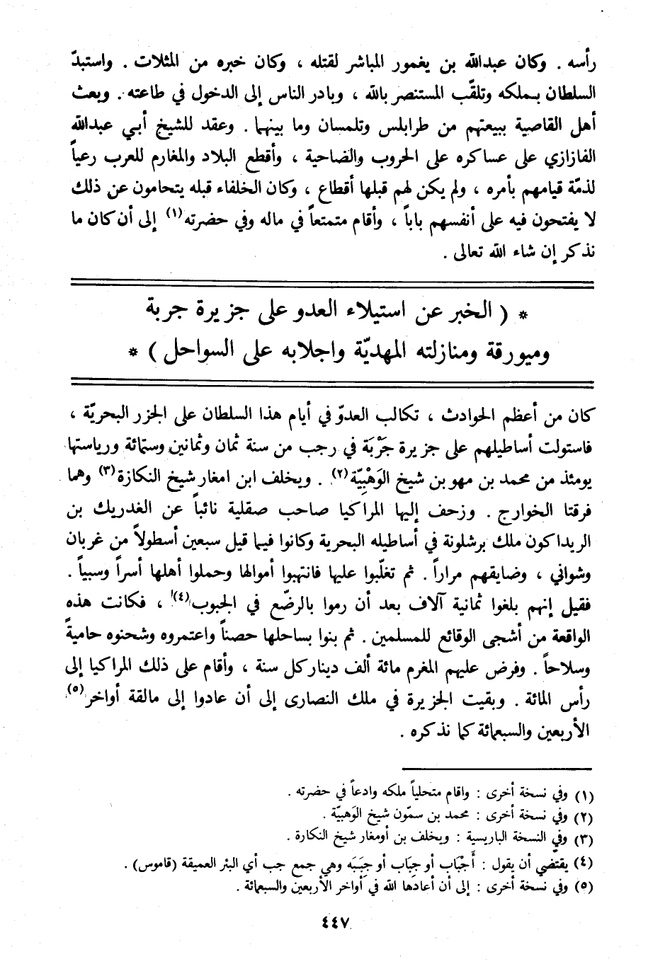 كان من أعظم الحوادث، تكالب العدوّ في أيام هذا السلطان على الجزر البحريّة، فاستولت أساطيلهم على جزيرة جربة في رجب من سنة ثمان وثمانين وستمائة ورياستها يومئذ من محمد بن مهو بن شيخ الوهبيّة [2] . ويخلف ابن امغار شيخ النكازة [3] وهما فرقتا الخوارج. وزحف إليها المراكيا صاحب صقلّيّة نائبا عن الغدريك بن الريداكون ملك برشلونة في أساطيله البحرية وكانوا فيما قيل سبعين أسطولا من غربان وشواني، وضايقهم مرارا. ثم تغلّبوا عليها فانتهبوا أموالها وحملوا أهلها أسرا وسبيا.