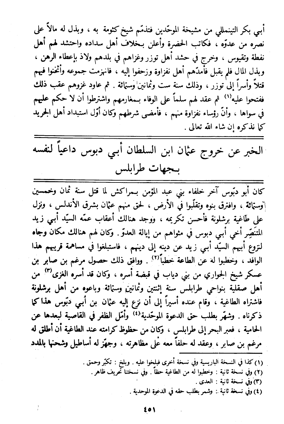 كان أبو دبّوس آخر خلفاء بني عبد المؤمن بمراكش لما قتل سنة ثمان وخمسين وستمائة، وافترق بنوه وتقلّبوا في الأرض، لحق منهم عثمان بشرق الأندلس، ونزل على طاغية برشلونة فأحسن تكريمه، ووجد هنالك أعقاب عمّه السيّد أبي زيد المتنصّر أخي أبي دبوس في مثواهم من إيالة العدوّ. وكان لهم هنالك مكان وجاه لنزوع أبيهم السيّد أبي زيد عن دينه إلى دينهم، فاستبلغوا في مساهمة قريبهم هذا الوافد، وخطبوا له عن الطاعة خطبا [2] . ووافق ذلك حصول مرغم بن صابر بن عسكر شيخ الجواري من بني دياب في قبضة أسره، وكان قد أسره الغزى [3] من أهل صقلّيّة بنواحي طرابلس سنة اثنتين وثمانين وستمائة وباعوه من أهل برشلونة فاشتراه الطاغية، وقام عنده أسيرا إلى أن نزع إليه عثمان بن أبي دبّوس هذا كما ذكرناه. وشهّر بطلب حق الدعوة الموحّدية [4] وأمّل الظفر في القاصية لبعدها عن الحامية، فعبر البحر إلى طرابلس، وكان من حظوظ كرامته عند الطاغية أن أطلق له مرغم بن صابر، وعقد له حلفا معه على مظاهرته، وجهّز له أساطيل وشحنها بالمدد