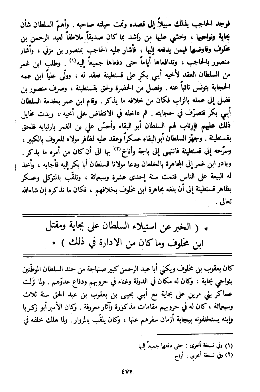 فوجد الحاجب بذلك سبيلا إلى قصده وتمت حيلته صاحبه. وأهمّ السلطان شأن بجاية ونواحيها، وخشي عليها من راشد بما كان صديقا ملاطفا لعبد الرحمن بن مخلوف وفاوضهما فيمن يدفعه إليها، فأشار عليه الحاجب بمنصور بن مزني، وأشار منصور بالحاجب، وتدافعاها أياما حتى دفعاها جميعا إليه [1] . وطلب ابن غمر من السلطان العقد لأخيه أبي بكر على قسنطينة فعقد له، وولّى عليا ابن عمه الحجابة بتونس نائبا عنه. وفصل من الحضرة ولحق بقسنطينة، وصرف منصور بن فضل إلى عمله بالزاب فكان من خلافه ما يذكر. وقام ابن عمر بخدمة السلطان أبي بكر فتصرّف في حجابته. ثم داخله في الانتقاض على أخيه، وبدت مخايل ذلك عليهم فارتاب لهم السلطان أبو البقاء وأحسّ علي بن الغمر بارتيابه فلحق بقسنطينة. وجهّز السلطان أبو البقاء عسكرا وعقد عليه لظافر مولاه المعروف بالكبير، وسرّحه إلى قسنطينة فانتهى إلى باجة وأناخ [2] بها الى أن كان من أمره ما يذكر.