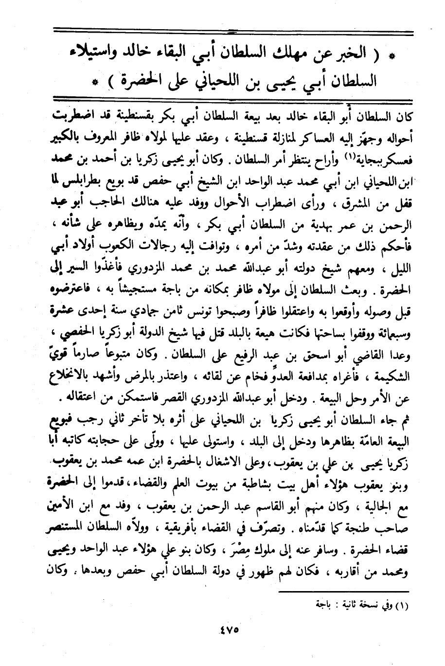 كان السلطان أبو البقاء خالد بعد بيعة السلطان أبي بكر بقسنطينة قد اضطربت أحواله وجهّز إليه العساكر لمنازلة قسنطينة، وعقد عليها لمولاه ظافر المعروف بالكبير فعسكر ببجاية [1] وأراح ينتظر أمر السلطان. وكان أبو يحيى زكريا بن أحمد بن محمد ابن اللحياني ابن أبي محمد عبد الواحد ابن الشيخ أبي حفص قد بويع بطرابلس لما قفل من المشرق، ورأى اضطراب الأحوال ووفد عليه هنالك الحاجب أبو عبد الرحمن بن عمر بهدية من السلطان أبي بكر، وأنّه يمدّه ويظاهره على شأنه، فأحكم ذلك من عقدته وشدّ من أمره، وتوافت إليه رجالات الكعوب أولاد أبي الليل، ومعهم شيخ دولته أبو عبد الله محمد بن محمد المزدوري فأغذّوا السير إلى الحضرة. وبعث السلطان إلى مولاه ظافر بمكانه من باجة مستجيشا به، فاعترضوه قبل وصوله وأوقعوا به واعتقلوا ظافرا وصبحوا تونس ثامن جمادى سنة إحدى عشرة وسبعمائة ووقفوا بساحتها فكانت هيعة بالبلد قتل فيها شيخ الدولة أبو زكريا الحفصي، وعدا القاضي أبو إسحاق بن عبد الرفيع على السلطان. وكان متبوعا صارما قويّ الشكيمة، فأغراه بمدافعة العدوّ فخام عن لقائه، واعتذر بالمرض وأشهد بالانخلاع عن الأمر وحل البيعة. ودخل أبو عبد الله المزدوري القصر فاستمكن من اعتقاله.