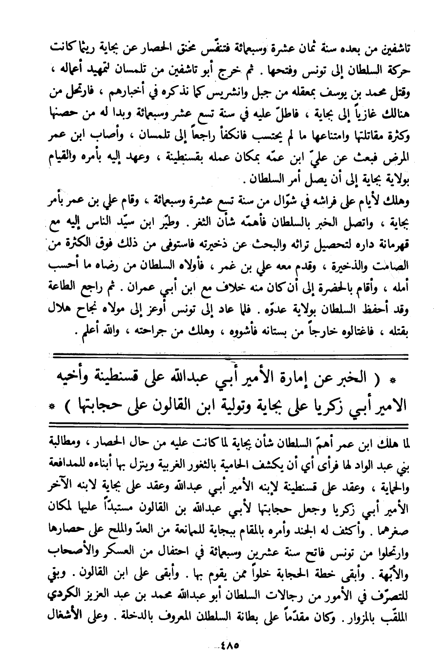 (الخبر عن إمارة الأمير أبي عبد الله على قسنطينة وأخيه الأمير أبي زكريا على بجاية وتولية ابن القالون على حجابتها)