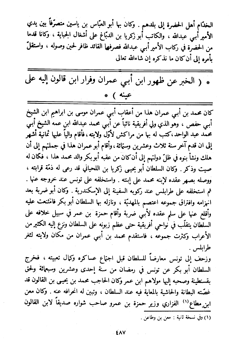 وزحف إلى تونس معارضا للسلطان قبل اجتماع عساكره وكمال تعبيته، فخرج السلطان أبو بكر عن تونس في رمضان من سنة إحدى وعشرين وسبعمائة ولحق بقسنطينة وصحبه إليها مولاهم ابن عمر وكان الحاجب محمد بن يحيى بن القالون قد غصّته البطانة والحاشية بالمعاية فيه عند السلطان، وتبين له انحرافه عنه. وكان معن ابن مطاع [1] الفزاري وزير حمزة بن عمرو صاحب شواره صديقا لابن القالون