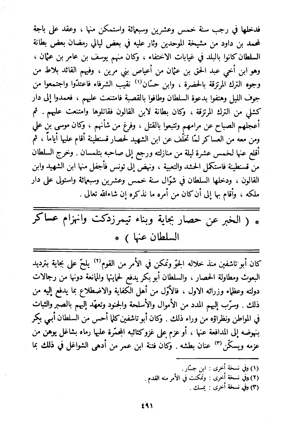 كان أبو تاشفين منذ خلاله الجوّ وتمكن في الأمر من القوم [2] يلحّ على بجاية بترديد البعوث ومطاولة الحصار، والسلطان أبو بكر يدفع لحمايتها والممانعة دونها من رجالات دولته وعظماء وزرائه الأول، فالأوّل من أهل الكفاية والاضطلاع بما يدفع إليه من ذلك. وسرّب إليهم المدد من الأموال والأسلحة والجنود وتعهّد إليهم بالصبر والثبات في المواطن ونظراؤه من وراء ذلك. وكان أبو تاشفين كلما أحس من السلطان أبي بكر بنهوضه إلى المدافعة عنها، أو عزم على غزو كتائبه المجمّرة عليها رماه بشاغل يوهن من عزمه ويسكّن [3] عنان بطشه. وكان فتنة ابن عمر من أدهى الشواغل في ذلك بما