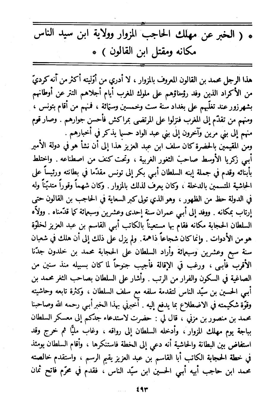 (الخبر عن مهلك الحاجب المزوار وولاية ابن سيد الناس مكانه ومقتل ابن القالون)