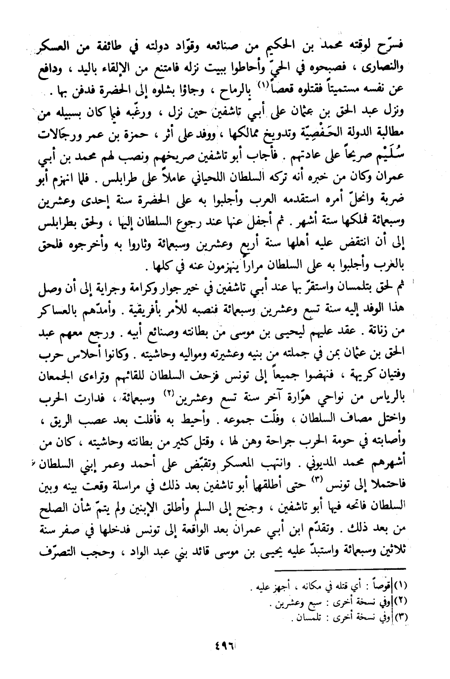 ثم لحق بتلمسان واستقرّ بها عند أبي تاشفين في خير جوار وكرامة وجراية إلى أن وصل هذا الوفد إليه سنة تسع وعشرين وسبعمائة فنصبه للأمر بإفريقية. وأمدّهم بالعساكر من زناتة. عقد عليهم ليحيى بن موسى من بطانته وصنائع أبيه. ورجع معهم عبد الحق بن عثمان بمن في جملته من بنيه وعشيرته ومواليه وحاشيته. وكانوا أحلاس حرب وفتيان كريهة، فنهضوا جميعا إلى تونس فزحف السلطان للقائهم وتراءى الجمعان بالرياس من نواحي هوّارة آخر سنة تسع وعشرين [2] وسبعمائة، فدارت الحرب واختل مصاف السلطان، وفلّت جموعه. وأحيط به فأفلت بعد عصب الريق، وأصابته في حومة الحرب جراحة وهن لها، وقتل كثير من بطانته وحاشيته، كان من أشهرهم محمد المديوني. وانتهب المعسكر وتقبّض على أحمد وعمر ابني السلطان فاحتملا إلى تونس [3] حتى أطلقهما أبو تاشفين بعد ذلك في مراسلة وقعت بينه وبين السلطان فاتحه فيها أبو تاشفين، وجنح إلى السلم وأطلق الابنين ولم يتمّ شأن الصلح من بعد ذلك. وتقدّم ابن أبي عمران بعد الواقعة إلى تونس فدخلها في صفر سنة ثلاثين وسبعمائة واستبدّ عليه يحيى بن موسى قائد بني عبد الواد، وحجب التصرّف