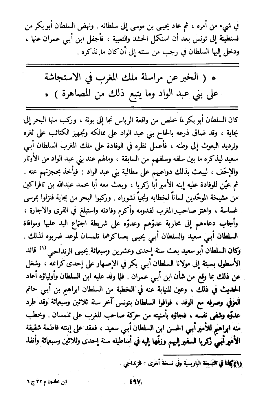 (الخبر عن مراسلة ملك المغرب في الاستجاشة على بني عبد الواد وما يتبع ذلك من المصاهرة)