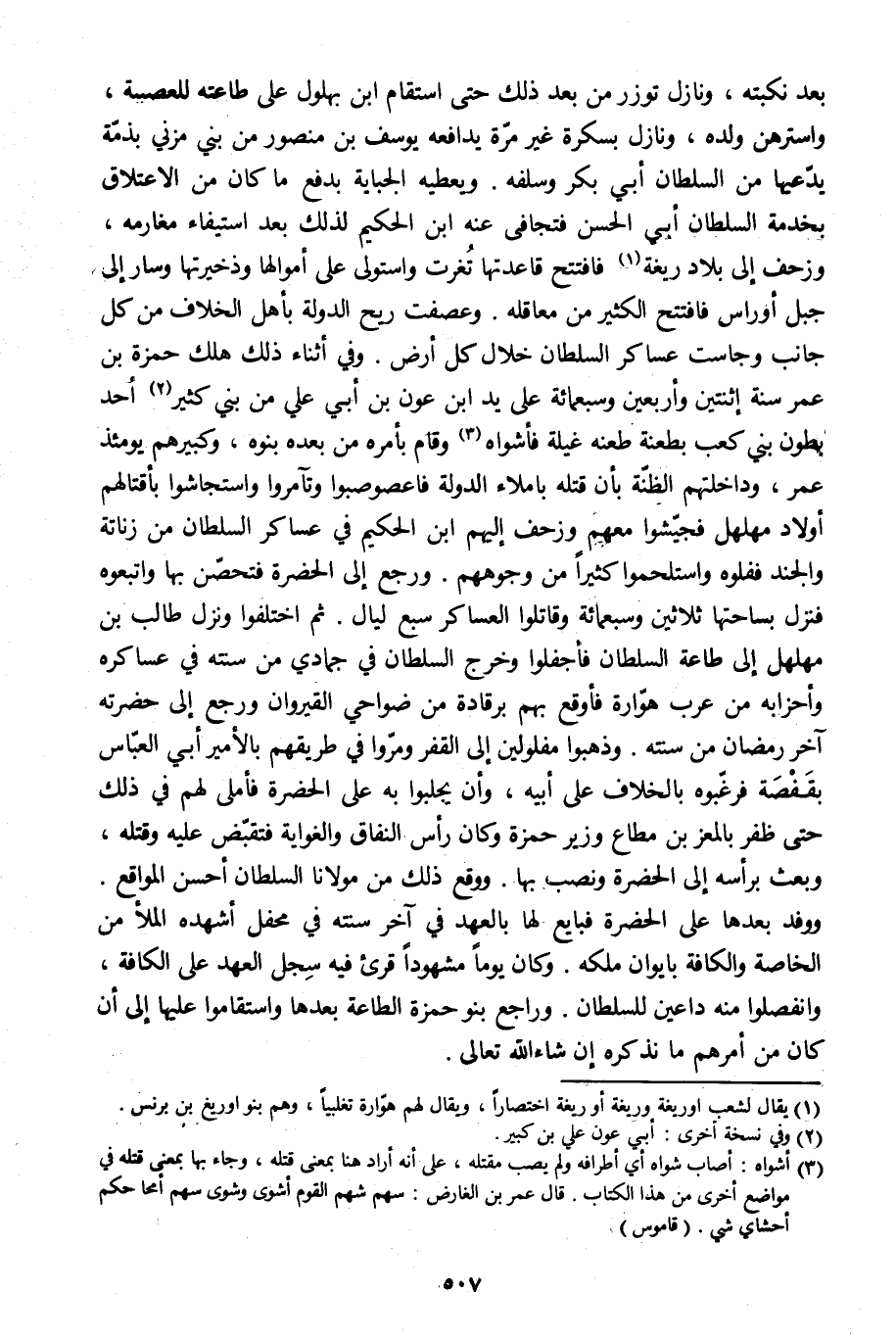 بعد نكبته، ونازل توزر من بعد ذلك حتى استقام ابن بهلول على طاعته للعصبية، واسترهن ولده، ونازل بسكرة غير مرّة يدافعه يوسف بن منصور من بني مزني بذمّة يدّعيها من السلطان أبي بكر وسلفه. ويعطيه الجباية بدفع ما كان من الاعتلاق بخدمة السلطان أبي الحسن فتجافى عنه ابن الحكيم لذلك بعد استيفاء مغارمه، وزحف إلى بلاد ريغة [1] فافتتح قاعدتها تغرت واستولى على أموالها وذخيرتها وسار إلى جبل أوراس فافتتح الكثير من معاقلة. وعصفت ريح الدولة بأهل الخلاف من كل جانب وجاست عساكر السلطان خلال كل أرض. وفي أثناء ذلك هلك حمزة بن عمر سنة اثنتين وأربعين وسبعمائة على يد ابن عون بن أبي علي من بني كثير [2] أحد بطون بني كعب بطعنة طعنه غيلة فأشواه [3] وقام بأمره من بعده بنوه، وكبيرهم يومئذ عمر، وداخلتهم الظنّة بأن قتله بإملاء الدولة فاعصوصبوا وتآمروا واستجاشوا بأقتالهم أولاد مهلهل فجيّشوا معهم وزحف إليهم ابن الحكيم في عساكر السلطان من زناتة والجند ففلوه واستلحموا كثيرا من وجوههم. ورجع إلى الحضرة فتحصّن بها واتبعوه فنزل بساحتها ثلاثين وسبعمائة وقاتلوا العساكر سبع ليال. ثم اختلفوا ونزل طالب بن مهلهل إلى طاعة السلطان فأجفلوا وخرج السلطان في جمادى من سنته في عساكره وأحزابه من عرب هوّارة فأوقع بهم برقادة من ضواحي القيروان ورجع إلى حضرته آخر رمضان من سنته. وذهبوا مفلولين إلى القفر ومرّوا في طريقهم بالأمير أبي العبّاس بقفصة فرغّبوه بالخلاف على أبيه، وأن يجلبوا به على الحضرة فأملى لهم في ذلك حتى ظفر بالمعز بن مطاع وزير حمزة وكان رأس النفاق والغواية فتقبّض عليه وقتله، وبعث برأسه إلى الحضرة ونصب بها. ووقع ذلك من مولانا السلطان أحسن المواقع.