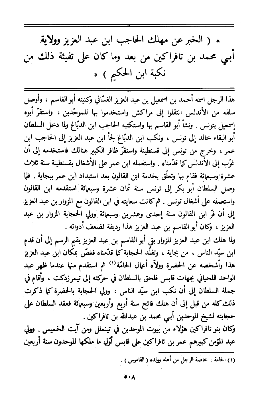 ولما هلك ابن عبد العزيز المزوار بقي أبو القاسم بن عبد العزيز يقيم الرسم إلى أن قدم ابن سيّد الناس، من بجاية، وتقلّد الحجابة كما قدّمناه فغصّ بمكان ابن عبد العزيز هذا وأشخصه عن الحضرة وولّاه أعمال الحامّة [1] ثم استقدم منها عند ما ظهر عبد الواحد اللحياني بجهات قابس فلحق بالسلطان في حركته إلى تيمرزدكت، وأقام في جملة السلطان إلى أن نكب ابن سيّد الناس، وولي الحجابة بالحضرة كما ذكرت ذلك كله من قبل إلى أن هلك فاتح سنة أربع وأربعين وسبعمائة فعقد السلطان على حجابته لشيخ الموحدين أبي محمد بن عبد الله بن تافراكين.