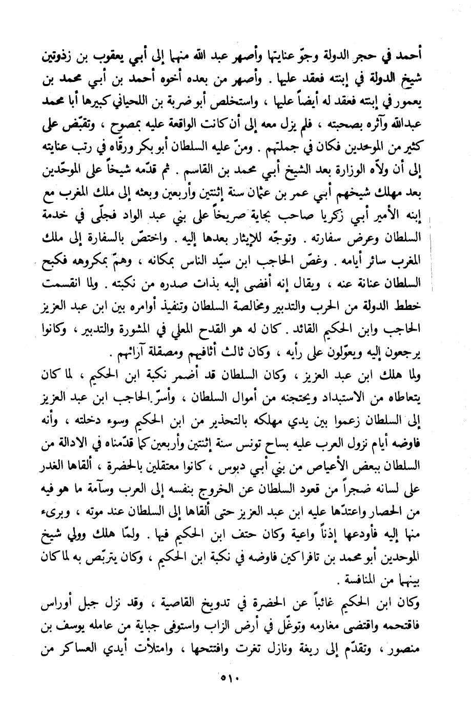 ولما هلك ابن عبد العزيز، وكان السلطان قد أضمر نكبة ابن الحكيم، لما كان يتعاطاه من الاستبداد ويحتجنه من أموال السلطان، وأسرّ الحاجب ابن عبد العزيز إلى السلطان زعموا بين يدي مهلكه بالتحذير من ابن الحكيم وسوء دخلته، وأنه فاوضه أيام نزول العرب عليه بساح تونس سنة اثنتين وأربعين كما قدّمناه في الادالة من السلطان ببعض الأعياص من بني أبي دبوس، كانوا معتقلين بالحضرة، ألقاها الغدر على لسانه ضجرا من قعود السلطان عن الخروج بنفسه إلى العرب وسآمة ما هو فيه من الحصار واعتدّها عليه ابن عبد العزيز حتى ألقاها إلى السلطان عند موته، وبريء منها إليه فأودعها إذنا واعية وكان حتف ابن الحكيم فيها. ولمّا هلك وولي شيخ الموحدين أبو محمد بن تافراكين فاوضه في نكبة ابن الحكيم، وكان يتربّض به لما كان بينهما من المنافسة.