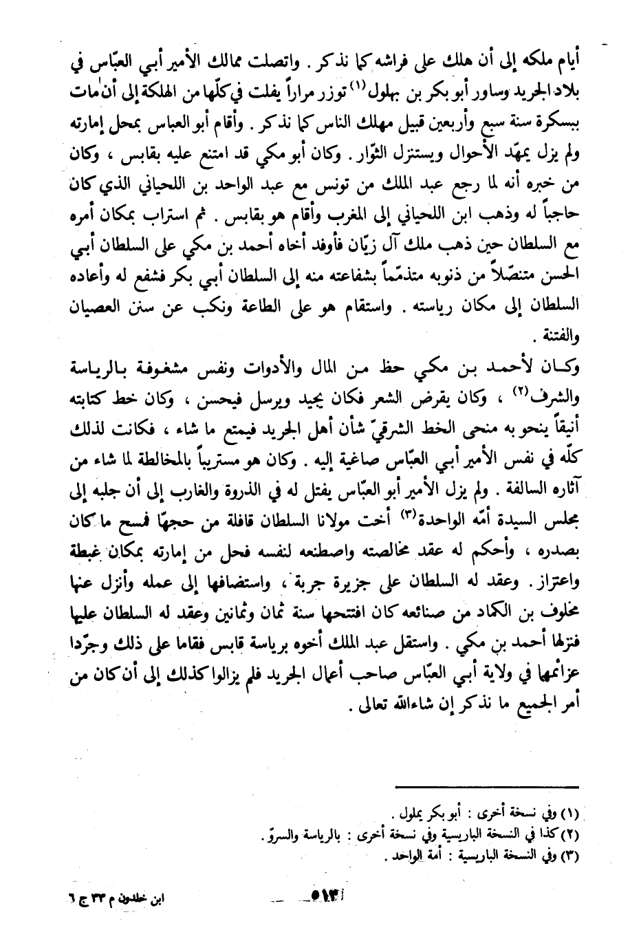 أيام ملكه إلى أن هلك على فراشه كما نذكر. واتصلت ممالك الأمير أبي العبّاس في بلاد الجريد وساور أبو بكر بن بهلول [1] توزر مرارا يفلت في كلّها من الهلكة إلى أن مات ببسكرة سنة سبع وأربعين قبيل مهلك الناس كما نذكر. وأقام أبو العباس بمحل إمارته ولم يزل يمهّد الأحوال ويستنزل الثوّار. وكان أبو مكي قد امتنع عليه بقابس، وكان من خبره أنه لما رجع عبد الملك من تونس مع عبد الواحد بن اللحياني الّذي كان حاجبا له وذهب ابن اللحياني إلى المغرب وأقام هو بقابس. ثم استراب بمكان أمره مع السلطان حين ذهب ملك آل زيّان فأوفد أخاه أحمد بن مكي على السلطان أبي الحسن متنصّلا من ذنوبه متذمّما بشفاعته منه إلى السلطان أبي بكر فشفع له وأعاده السلطان إلى مكان رياسته. واستقام هو على الطاعة ونكب عن سنن العصيان والفتنة.
