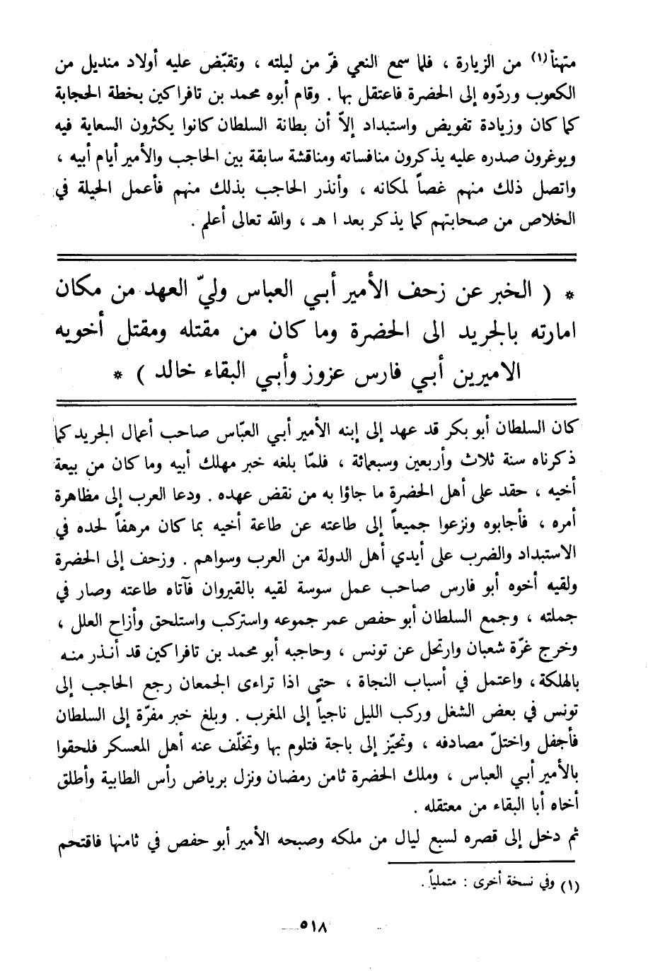 متهنئا [1] من الزيارة، فلما سمع النعي فرّ من ليلته، وتقبّض عليه أولاد منديل من الكعوب وردّوه إلى الحضرة فاعتقل بها. وقام أبوه محمد بن تافراكين بخطة الحجابة كما كان وزيادة تفويض واستبداد إلّا أن بطانة السلطان كانوا يكثرون السعاية فيه ويوغرون صدره عليه يذكرون منافساته ومناقشة سابقة بين الحاجب والأمير أيام أبيه، واتصل ذلك منهم غصا لمكانه، وأنذر الحاجب بذلك منهم فأعمل الحيلة في الخلاص من صحابتهم كما يذكر بعد أهـ، والله تعالى أعلم.