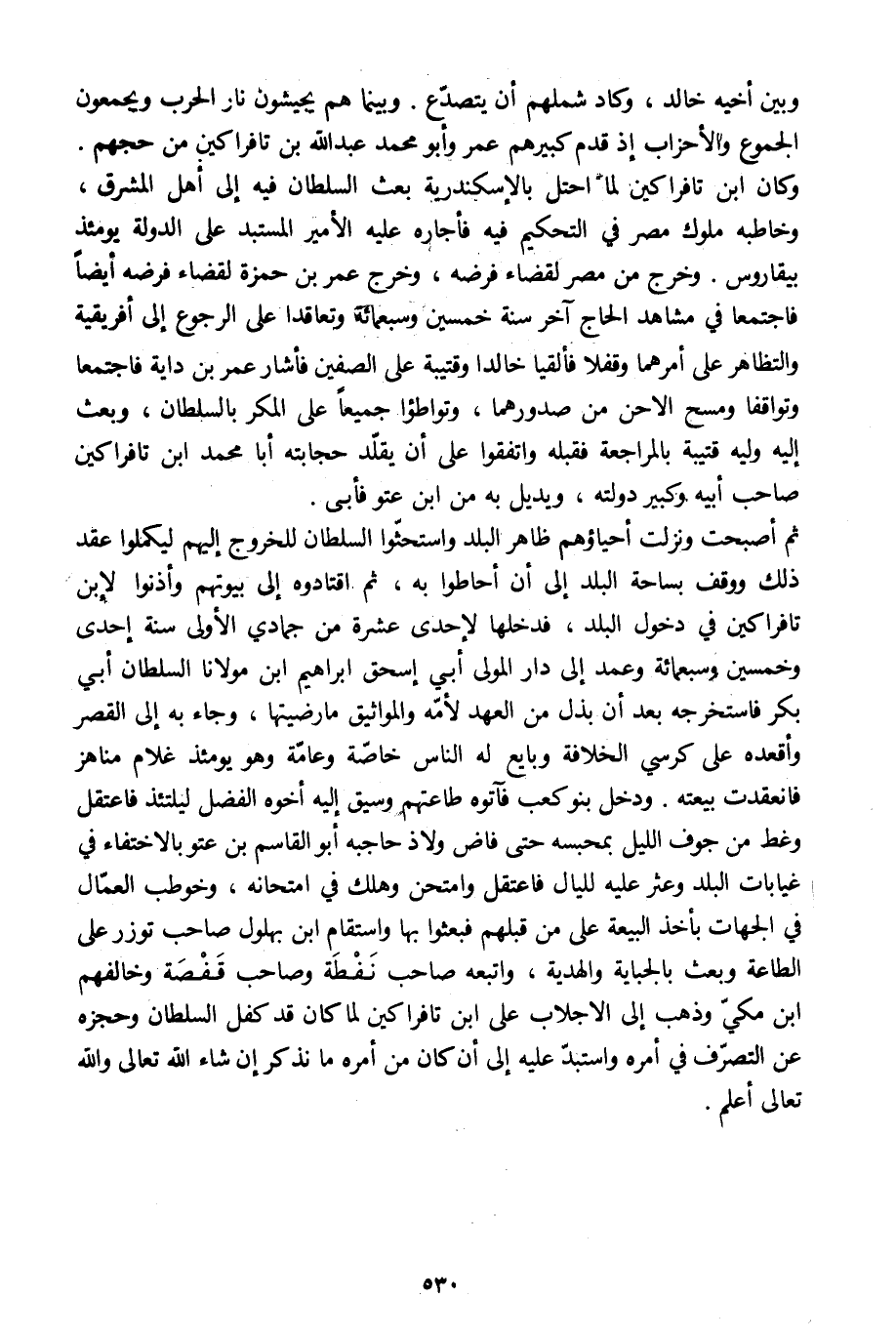 ثم أصبحت ونزلت أحياؤهم ظاهر البلد واستحثّوا السلطان للخروج إليهم ليكملوا عقد ذلك ووقف بساحة البلد إلى أن أحاطوا به، ثم اقتادوه إلى بيوتهم وأذنوا لابن تافراكين في دخول البلد، فدخلها لإحدى عشرة من جمادى الأولى سنة إحدى وخمسين وسبعمائة وعمد إلى دار المولى أبي إسحاق إبراهيم ابن مولانا السلطان أبي بكر فاستخرجه بعد أن بذل من العهد لأمّه والمواثيق ما رضيتها، وجاء به إلى القصر وأقعده على كرسي الخلافة وبايع له الناس خاصّة وعامّة وهو يومئذ غلام مناهز فانعقدت بيعته. ودخل بنو كعب فآتوه طاعتهم وسيق إليه أخوه الفضل ليلتئذ فاعتقل وغط من جوف الليل بمحبسه حتى فاض ولاذ حاجبه أبو القاسم بن عتو بالاختفاء في غيابات البلد وعثر عليه لليال فاعتقل وامتحن وهلك في امتحانه، وخوطب العمّال في الجهات بأخذ البيعة على من قبلهم فبعثوا بها واستقام ابن بهلول صاحب توزر على الطاعة وبعث بالجباية والهدية، واتبعه صاحب نفطة وصاحب قفصة وخالفهم ابن مكّي وذهب إلى الاجلاب على ابن تافراكين لما كان قد كفل السلطان وحجزه عن التصرّف في أمره واستبدّ عليه إلى أن كان من أمره ما نذكر إن شاء الله تعالى والله تعالى أعلم
