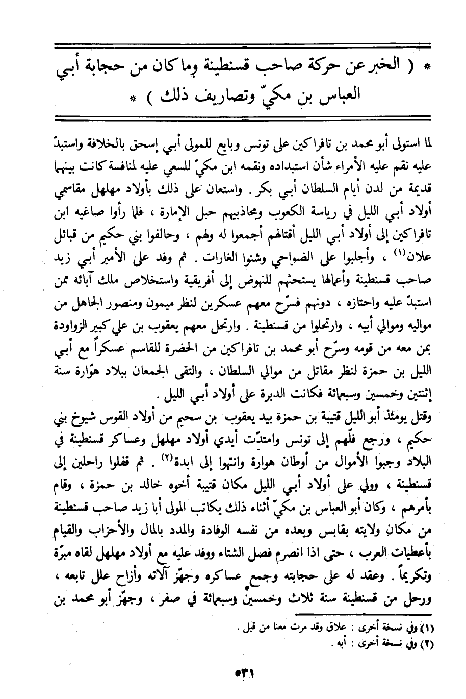 وقتل يومئذ أبو الليل قتيبة بن حمزة بيد يعقوب بن سحيم من أولاد القوس شيوخ بني حكيم، ورجع فلّهم إلى تونس وامتدّت أيدي أولاد مهلهل وعساكر قسنطينة في البلاد وجبوا الأموال من أوطان هوارة وانتهوا إلى أبدة [2] . ثم قفلوا راحلين إلى قسنطينة، وولي على أولاد أبي الليل مكان قتيبة أخوه خالد بن حمزة، وقام بأمرهم، وكان أبو العباس بن مكّي أثناء ذلك يكاتب المولى أبا زيد صاحب قسنطينة من مكان ولايته بقابس ويعده من نفسه الوفادة والمدد بالمال والأحزاب والقيام بأعطيات العرب، حتى إذا انصرم فصل الشتاء ووفد عليه مع أولاد مهلهل لقاه مبرّة وتكريما. وعقد له على حجابته وجمع عساكره وجهّز آلاته وأزاح علل تابعه، ورحل من قسنطينة سنة ثلاث وخمسين وسبعمائة في صفر، وجهّز أبو محمد بن
