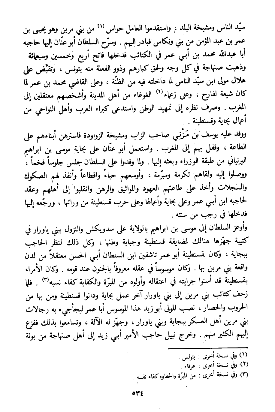 سيّد الناس ومشيخة البلد، واستقدموا العامل حواس [1] من بني مرين وهو يحيى بن عمر بن عبد المؤمن من بني ونكاس فبادر اليهم. وسرّح السلطان أبو عنّان إليها حاجبه أبا عبد الله محمد بن أبي عمر في الكتائب فدخلها فاتح أربع وخمسين وسبعمائة وذهبت صنهاجة في كل وجه ولحق كبارهم وذوو الفعلة منه بتونس، وتقبّض على هلال مولى ابن سيّد الناس لما داخلته فيه من الظنّة، وعلى القاضي محمد بن عمر لما كان شيعة لفارح، وعلى زعماء [2] الغوغاء من أهل المدينة وأشخصهم معتقلين إلى المغرب. وصرف نظره إلى تمهيد الوطن واستدعى كبراء العرب وأهل النواحي من أعمال بجاية وقسنطينة.