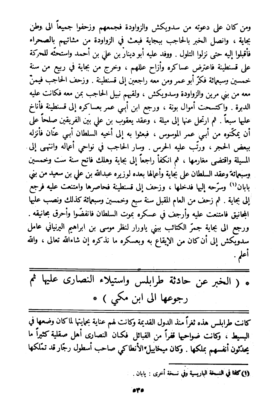 (الخبر عن حادثة طرابلس واستيلاء النصارى عليها ثم رجوعها الى ابن مكي)