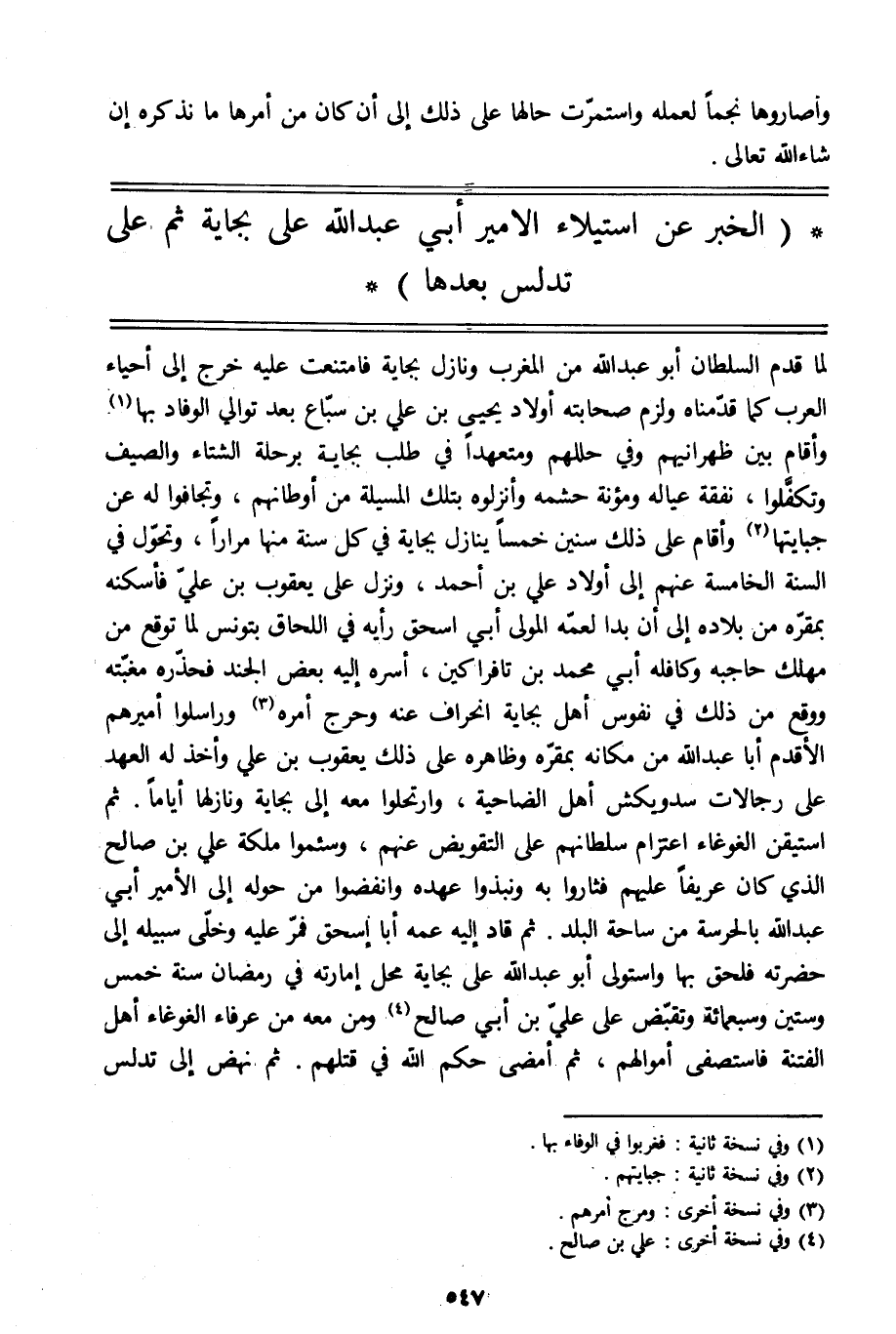 (الخبر عن استيلاء الأمير أبي عبد الله على بجاية ثم على تدلس بعدها) لما قدم السلطان أبو عبد الله من المغرب ونازل بجاية فامتنعت عليه خرج إلى أحياء العرب كما قدّمناه ولزم صحابته أولاد يحيى بن علي بن سبّاع بعد توالي الوفاد بها [1] وأقام بين ظهرانيهم وفي حللهم ومتعهدا في طلب بجاية برحلة الشتاء والصيف وتكفّلوا، نفقة عياله ومؤنة حشمه وأنزلوه بتلك المسيلة من أوطانهم، وتجافوا له عن جبايتها [2] وأقام على ذلك سنين خمسا ينازل بجاية في كل سنة منها مرارا، وتحوّل في السنة الخامسة عنهم إلى أولاد علي بن أحمد، ونزل على يعقوب بن عليّ فأسكنه بمقرّه من بلاده إلى أن بدا لعمّه المولى أبي إسحاق رأيه في اللحاق بتونس لما توقع من مهلك حاجبه وكافله أبي محمد بن تافراكين، أسره إليه بعض الجند فحذّره مغبّته ووقع من ذلك في نفوس أهل بجاية انحراف عنه وحرج أمره [3] وراسلوا أميرهم الأقدم أبا عبد الله من مكانه بمقرّه وظاهره على ذلك يعقوب بن علي وأخذ له العهد على رجالات سدويكش أهل الضاحية، وارتحلوا معه إلى بجاية ونازلها أياما. ثم استيقن الغوغاء اعتزام سلطانهم على التقويض عنهم، وسئموا ملكة علي بن صالح الّذي كان عريفا عليهم فثاروا به ونبذوا عهده وانفضوا من حوله إلى الأمير أبي عبد الله بالحرسة من ساحة البلد. ثم قاد إليه عمه أبا إسحاق فمرّ عليه وخلّى سبيله إلى حضرته فلحق بها واستولى أبو عبد الله على بجاية محل إمارته في رمضان سنة خمس وستين وسبعمائة وتقبّض على عليّ بن أبي صالح [4] ومن معه من عرفاء الغوغاء أهل الفتنة فاستصفى أموالهم، ثم أمضى حكم الله في قتلهم. ثم نهض إلى تدلس