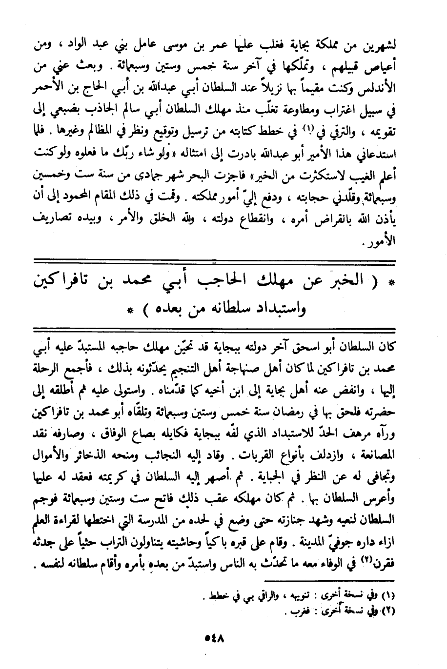 (الخبر عن مهلك الحاجب أبي محمد بن تافراكين واستبداد سلطانه من بعده) كان السلطان أبو إسحاق آخر دولته ببجاية قد تحيّن مهلك حاجبه المستبدّ عليه أبي محمد بن تافراكين لما كان أهل صنهاجة أهل التنجيم يحدّثونه بذلك، فأجمع الرحلة إليها، وانفض عنه أهل بجاية إلى ابن أخيه كما قدّمناه. واستولى عليه ثم أطلقه إلى حضرته فلحق بها في رمضان سنة خمس وستين وسبعمائة وتلقّاه أبو محمد بن تافراكين ورآه مرهف الحدّ للاستبداد الّذي لفّه ببجاية فكايله بصاع الوفاق، وصارفه نقد المصانعة، وازدلف بأنواع القربات. وقاد إليه النجائب ومنحه الذخائر والأموال وتجافى له عن النظر في الجباية. ثم أصهر إليه السلطان في كريمته فعقد له عليها وأعرس السلطان بها. ثم كان مهلكه عقب ذلك فاتح ست وستين وسبعمائة فوجم السلطان لنعيه وشهد جنازته حتى وضع في لحده من المدرسة التي اختطها لقراءة العلم إزاء داره جوفيّ المدينة. وقام على قبره باكيا وحاشيته يتناولون التراب حثيا على جدثه فقرن [2] في الوفاء معه ما تحدّث به الناس واستبدّ من بعده بأمره وأقام سلطانه لنفسه.