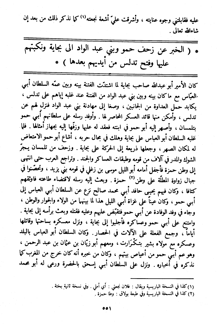 (الخبر عن زحف حمو وبني عبد الواد الى بجاية ونكبتهم عليها وفتح تدلس من أيديهم بعدها) كان الأمير أبو عبد الله صاحب بجاية لما اشتدّت الفتنة بينه وبين عمّه السلطان أبي العبّاس مع ما كان بينه وبين بني عبد الواد من الفتنة عند غلبه إياهم على تدلس، يكابد حمل العداوة من الجانبين، وصغا إلى مهادنة بني عبد الواد فنزل لهم عن تدلس، وأمكن منها قائد العسكر المحاصر لها. وأوفد رسله على سلطانهم أبي حمو بتلمسان، وأصهر إليه أبو حمو في ابنته فعقد له عليها وزفّها إليه بجهاز أمثالها. فلما غلبه السلطان أبو العباس على بجاية وهلك في مجال حربه، أشاع أبو حمو الامتعاض له لمكان الصهر، وجعلها ذريعة إلى الحركة على بجاية. وزحف من تلمسان يجرّ الشوك والمدر في آلاف من قومه طبقات العساكر والجند. وتراجع العرب حتى انتهى إلى وطن حمزة فأجفل أمامه أبو الليل موسى بن زغلي في قومه بني يزيد، وتحصّنوا في جبال زواوة المطلّة على وطن [2] حمزة. وبعث إليه رسله لاقتضاء طاعته فاوثقهم كتافا، وكان فيهم يحيى حافد أبي محمد صالح نزع عن السلطان أبي العباس إلى أبي حمو، وكان عينا على غزاة أبي الليل هذا لما بينهما من الولاء والجوار والوطن، وجاء في وفد الوفادة عن أبي حمو فتقبّض عليهم وعليه فقتله وبعث برأسه إلى بجاية.