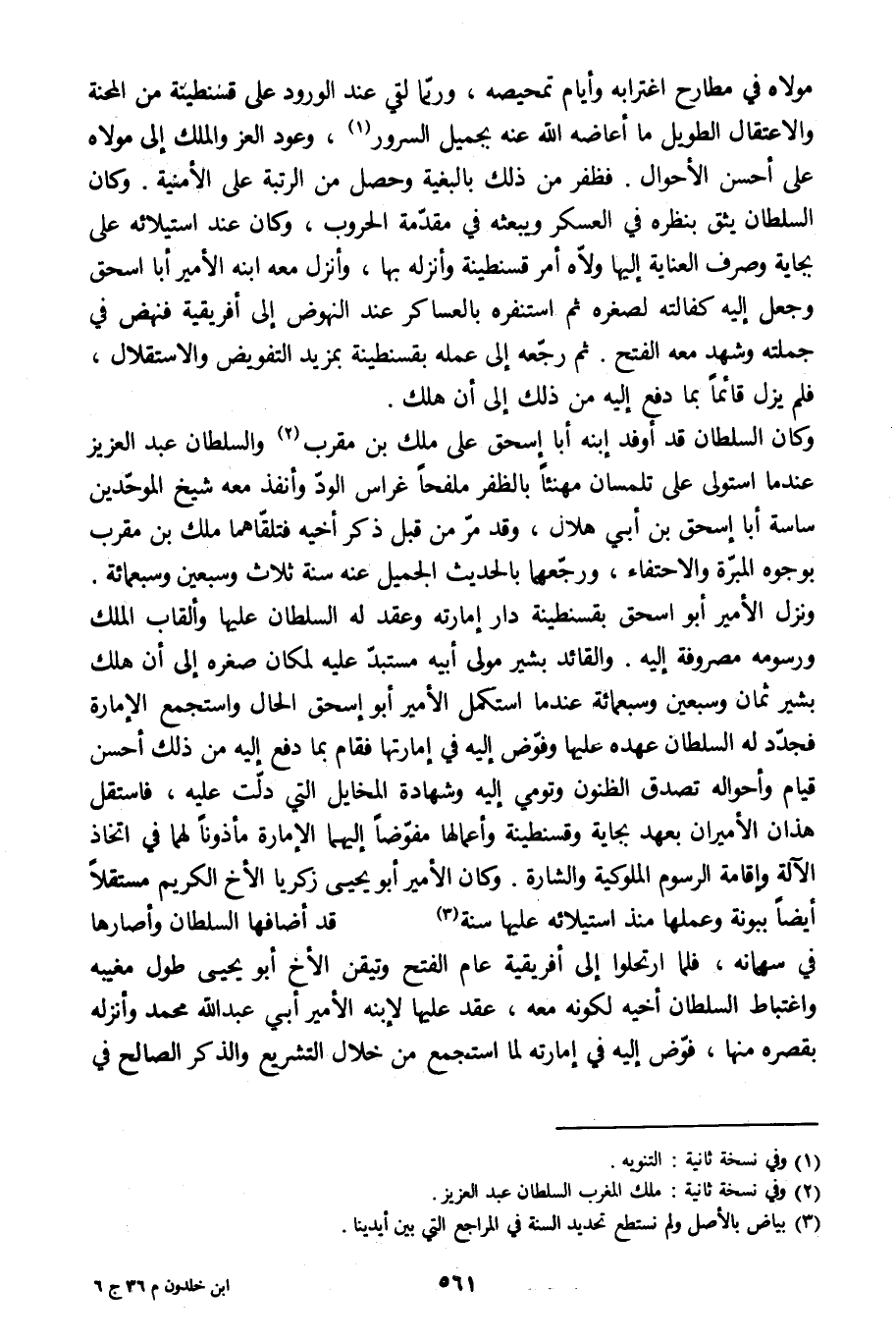 ونزل الأمير أبو إسحاق بقسنطينة دار إمارته وعقد له السلطان عليها وألقاب الملك ورسومه مصروفة إليه. والقائد بشير مولى أبيه مستبدّ عليه لمكان صغره إلى أن هلك بشير ثمان وسبعين وسبعمائة عند ما استكمل الأمير أبو إسحاق الحال واستجمع الإمارة فجدّد له السلطان عهده عليها وفوّض إليه في إمارتها فقام بما دفع إليه من ذلك أحسن قيام وأحواله تصدق الظنون وتومي إليه وشهادة المخايل التي دلّت عليه، فاستقل هذان الأميران بعهد بجاية وقسنطينة وأعمالها مفوّضا إليهما الإمارة مأذونا لهما في اتخاذ الآلة وإقامة الرسوم الملوكية والشارة. وكان الأمير أبو يحيى زكريا الأخ الكريم مستقلا أيضا ببونة وعملها منذ استيلائه عليها سنة [3] قد أضافها السلطان وأصارها في سهمانه، فلما ارتحلوا إلى إفريقية عام الفتح وتيقن الأخ أبو يحيى طول مغيبه واغتباط السلطان أخيه لكونه معه، عقد عليها لابنه الأمير أبي عبد الله محمد وأنزله بقصره منها، فوّض إليه في إمارته لما استجمع من خلال التشريع والذكر الصالح في