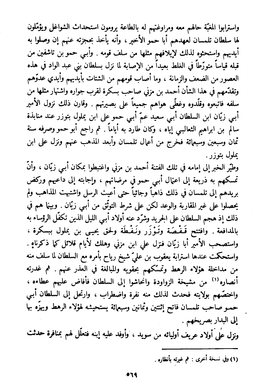 واسترابوا المغبّة حالهم معه ومراوغتهم له بالطاعة يرومون استحداث الشواغل ويؤمّلون لها سلطان تلمسان لعهدهم أبا حمو الأخير، وأنه يأخذ بحجزته عنهم إن وصلوا به أيديهم واستحثوه لذلك لإيلافهم مثلها من سلف قومه. وأبي حمو بن تاشفين من قبله قياسا متورّطا في الغلط بعيدا من الإصابة لما نزل بسلطان بني عبد الواد في هذه العصور من الضعف والزمانة، وما أصاب قومهم من الشتات بأيديهم وأيدي عدوّهم وتقدّمهم في هذا الشأن أحمد بن مزني صاحب بسكرة لقرب جواره واشتهار مثلها من سلفه فاتبعوه وقلّدوه وغطّى هواهم جميعا على بصيرتهم. وقارن ذلك نزول الأمير أبي زيّان ابن السلطان أبي سعيد عمّ أبي حمو على ابن يملول بتوزر عند منابذة سالم بن إبراهيم الثعالبي إياه، وكان طارد به أياما. ثم راجع أبو حمو وصرفه سنة ثمان وسبعين وسبعمائة فخرج من أعمال تلمسان وأبعد المذهب عنهم ونزل على ابن يملول بتوزر.