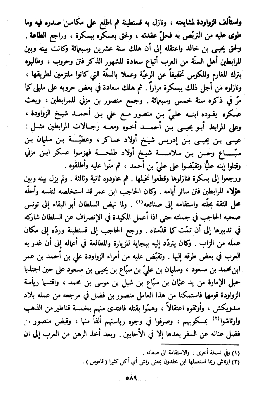 ورجعوا إلى بسكرة فنازلوها وقطعوا نخيلها. ثم عاودوه ثانية وثالثة. ولم يزل بينه وبين هؤلاء المرابطين فتن سائر أيامه. وكان الحاجب ابن عمر قد استخلصه لنفسه وأحلّه محل الثقة بحلّته واستقامة إلى صنائعه [1] . ولما نهض السلطان أبو البقاء إلى تونس صحبه الحاجب في جملته حتى إذا أعمل المكيدة في الانصراف عن السلطان شاركه في تدبيرها إلى أن تمّت كما قدّمناه. ورجع الحاجب إلى قسنطينة وردّه إلى مكان عمله من الزاب. وكان يتردّد إليه ببجاية للزيارة والمطالعة في أعماله إلى أن غدر به العرب في بعض طرقه إليها. وتقبّض عليه من أمراء الزواودة علي بن أحمد بن عمر ابن محمد بن مسعود، وسليمان بن عليّ بن سبّاع بن يحيى بن مسعود على حين اجتذبا حبل الإمارة من يد عثمان بن سبّاع بن شبل بن موسى بن محمد، واقتسما رياسة الزواودة قومهما فاستمكنا من هذا العامل منصور بن فضل في مرجعه من عمله بلاد سدويكش، وأوثقوه اعتقالا، وهمّوا بقتله فافتدى منهم بخمسة قناطير من الذهب وارتاشوا [2] بمسكوبهم، وصرفوا في وجوه رياستهم ألفا منها، وقبض منصور بن فضل عنانه عن السفر بعدها إلا في الأحايين. وبعد أخذ الرهن من العرب إلى أن