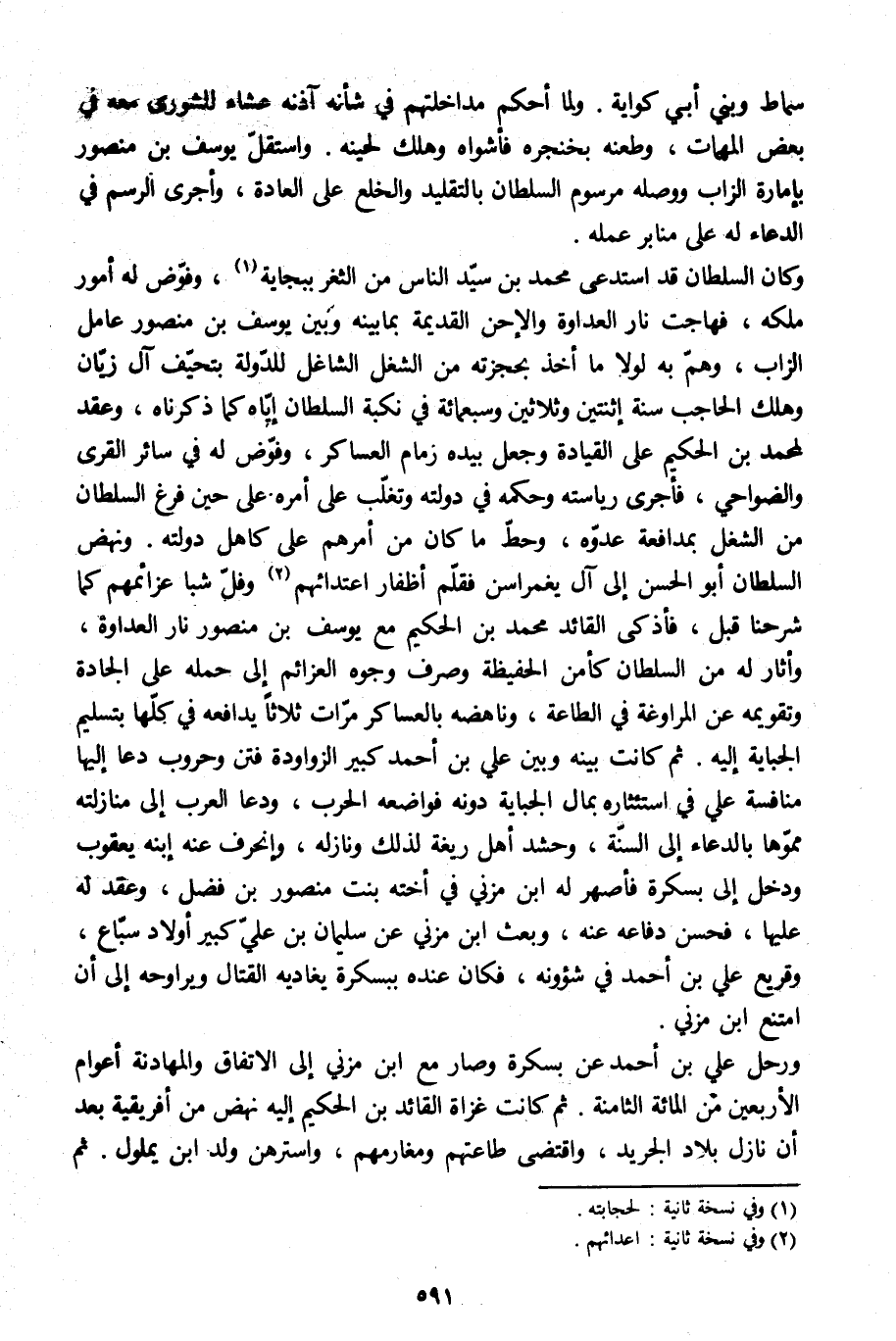وكان السلطان قد استدعى محمد بن سيّد الناس من الثغر ببجاية [1] ، وفوّض له أمور ملكه، فهاجت نار العداوة والإحن القديمة بما بينه وبين يوسف بن منصور عامل الزاب، وهمّ به لولا ما أخذ بحجزته من الشغل الشاغل للدّولة بتحيّف آل زيّان وهلك الحاجب سنة اثنتين وثلاثين وسبعمائة في نكبة السلطان إيّاه كما ذكرناه، وعقد لمحمد بن الحكيم على القيادة وجعل بيده زمام العساكر، وفوّض له في سائر القرى والضواحي، فأجرى رياسته وحكمه في دولته وتغلّب على أمره على حين فرغ السلطان من الشغل بمدافعة عدوّه، وحطّ ما كان من أمرهم على كاهل دولته. ونهض السلطان أبو الحسن إلى آل يغمراسن فقلّم أظفار اعتدائهم [2] وفلّ شبا عزائمهم كما شرحنا قبل، فأذكى القائد محمد بن الحكيم مع يوسف بن منصور نار العداوة، وأثار له من السلطان كأمن الحفيظة وصرف وجوه العزائم إلى حمله على الجادة وتقويمه عن المراوغة في الطاعة، وناهضه بالعساكر مرّات ثلاثا يدافعه في كلّها بتسليم الجباية إليه. ثم كانت بينه وبين علي بن أحمد كبير الزواودة فتن وحروب دعا إليها منافسة علي في استئثاره بمال الجباية دونه فواضعه الحرب، ودعا العرب إلى منازلته مموّها بالدعاء إلى السنّة، وحشد أهل ريغة لذلك ونازلة، وانحرف عنه ابنه يعقوب ودخل إلى بسكرة فأصهر له ابن مزني في أخته بنت منصور بن فضل، وعقد له عليها، فحسن دفاعه عنه، وبعث ابن مزني عن سليمان بن عليّ كبير أولاد سبّاع، وقريع علي بن أحمد في شئونه، فكان عنده ببسكرة يغاديه القتال ويراوحه إلى أن امتنع ابن مزني.