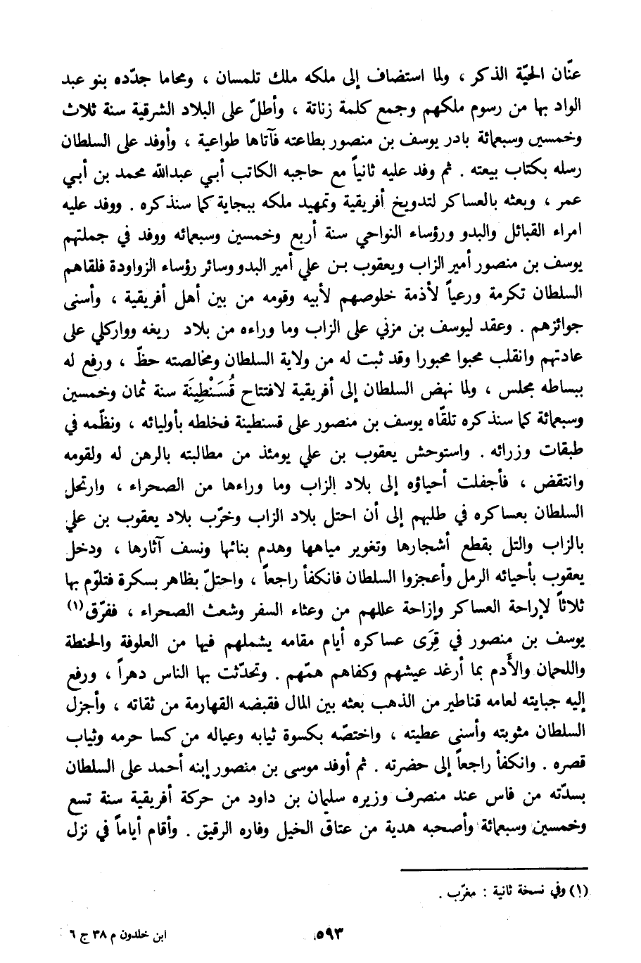عنّان الحيّة الذكر، ولما استضاف إلى ملكه ملك تلمسان، ومحا ما جدّده بنو عبد الواد بها من رسوم ملكهم وجمع كلمة زناتة، وأطلّ على البلاد الشرقية سنة ثلاث وخمسين وسبعمائة بادر يوسف بن منصور بطاعته فآتاها طواعية، وأوفد على السلطان رسله بكتاب بيعته. ثم وفد عليه ثانيا مع حاجبه الكاتب أبي عبد الله محمد بن أبي عمر، وبعثه بالعساكر لتدويخ إفريقية وتمهيد ملكه ببجاية كما سنذكره. ووفد عليه أمراء القبائل والبدو ورؤساء النواحي سنة أربع وخمسين وسبعمائة ووفد في جملتهم يوسف بن منصور أمير الزاب ويعقوب بن علي أمير البدو وسائر رؤساء الزواودة فلقاهم السلطان تكرمة ورعيا لأذمة خلوصهم لأبيه وقومه من بين أهل إفريقية، وأسنى جوائزهم. وعقد ليوسف بن مزني على الزاب وما وراءه من بلاد ريغه وواركلى على عادتهم وانقلب محبوا محبورا وقد ثبت له من ولاية السلطان ومخالصته حظّ، ورفع له ببساطه مجلس، ولما نهض السلطان إلى إفريقية لافتتاح قسنطينة سنة ثمان وخمسين وسبعمائة كما سنذكره تلقّاه يوسف بن منصور على قسنطينة فخلطه بأوليائه، ونظّمه في طبقات وزرائه. واستوحش يعقوب بن علي يومئذ من مطالبته بالرهن له ولقومه وانتقض، فأجفلت أحياؤه إلى بلاد الزاب وما وراءها من الصحراء، وارتحل السلطان بعساكره في طلبهم إلى أن احتل بلاد الزاب وخرّب بلاد يعقوب بن علي بالزاب والتل بقطع أشجارها وتغوير مياهها وهدم بنائها ونسف آثارها، ودخل يعقوب بأحيائه الرمل وأعجزوا السلطان فانكفأ راجعا، واحتلّ بظاهر يسكرة فتلوّم بها ثلاثا لإراحة العساكر وإزاحة عللهم من وعثاء السفر وشعث الصحراء، ففرّق [1] يوسف بن منصور في قرى عساكره أيام مقامه يشملهم فيها من العلوفة والحنطة واللحمان والأدم بما أرغد عيشهم وكفاهم همّهم. وتحدّثت بها الناس دهرا، ورفع إليه جبايته لعامه قناطير من الذهب بعثه بين المال فقبضه القهارمة من ثقاته، وأجزل السلطان مثوبته وأسنى عطيته، واختصّه بكسوة ثيابه وعياله من كسا حرمه وثياب قصره. وانكفأ راجعا إلى حضرته. ثم أوفد موسى بن منصور ابنه أحمد على السلطان بسدّته من فاس عند منصرف وزيره سليمان بن داود من حركة إفريقية سنة تسع خمسين وسبعمائة وأصحبه هدية من عتاق الخيل وفاره الرقيق. وأقام أياما في نزل