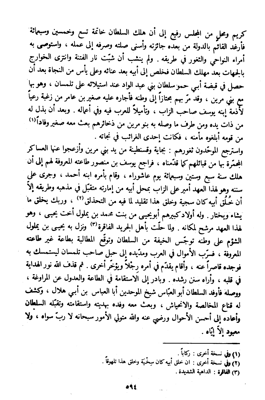واسترجع الموحّدون ثغورهم: بجاية وقسنطينة من يد بني مرين وأزعجوا عنها العساكر المجمّرة بها من قبائلهم كما قدّمناه، فراجع يوسف بن منصور طاعته المعروفة لهم إلى أن هلك سنة سبع وستين وسبعمائة يوم عاشوراء، وقام بأمره ابنه أحمد، وجرى على سننه وهو لهذا العهد أمير على الزاب بمحل أبيه من إمارته متقبّل في مذهبه وطريقه إلّا أن خلق أبيه كان سجية وخلق هذا تقليد لما فيه من التحذلق [2] ، وربك يخلق ما يشاء ويختار. وله أولاد كبيرهم أبو يحيى من بنت محمد بن يملول أخت يحيى، وهو لهذا العهد مرشح لمكانه. ولما حلّت بأهل الجريد الفاقرة [3] ونزل به يحيى بن يملول الشؤم على وطنه توجّس الخيفة من السلطان وتوقّع المطالبة بطاعة غير طاعته المعروفة، فسرّب الأموال في العرب ومدّيده إلى حبل صاحب تلمسان ليستمسك به فوجده قاصرا عنه، وأقام يقدّم في أمره رجلا ويؤخّر أخرى. ثم قذف الله نور الهداية في قلبه، وأراه سنن رشده. وبادر إلى الاستقامة في الطاعة والعدول عن المراوغة، ووصله فأوفد السلطان أبو العبّاس شيخ الموحدين أبا العباس بن أبي هلال، وكشف له قناع المخالصة والانحياش، وبعث معه وفده بهديته واستقامته وتقبّله السلطان وأعاده إلى أحسن الأحوال ورضي عنه والله متولي الأمور سبحانه لا ربّ سواه، ولا معبود إلّا إيّاه.
