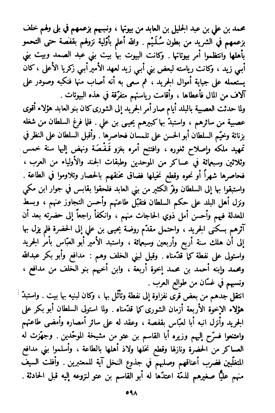واستبقوا بها إلى السلطان وفرّ الكثير من بني العابد فلحقوا بقابس في جوار ابن مكي ونزل أهل البلد على حكم السلطان فتقبّل طاعتهم وأحسن التجاوز عنهم، وبسط المعدلة فيهم وأحسن أمل ذوي الحاجات منهم، وانكفأ راجعا إلى حضرته بعد أن آثرهم بسكنى الجريد، واحتمل مقدّم روضة يحيى بن علي إلى الحضرة فلم يزل بها إلى أن هلك سنة أربع وأربعين وسبعمائة، واستبد الأمير أبو العبّاس بأمر الجريد واستولى على نفطة كما قدّمناه. وقيل لبني الخلف وهم: مدافع وأبو بكر عبد الله ومحمد وابنه أحمد بن محمد إخوة أربعة، وابن أخيهم بنو الخلف من مدافع، ونسبهم في غسّان من طوالع العرب.