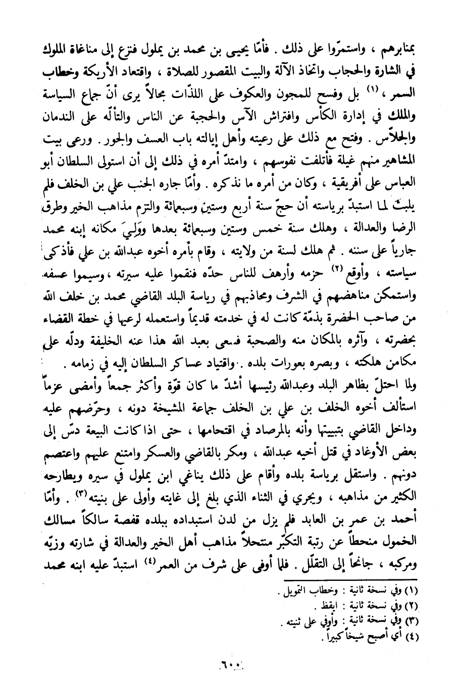 بمنابرهم، واستمرّوا على ذلك. فأمّا يحيى بن محمد بن يملول فنزع إلى مناغاة الملوك في الشارة والحجاب واتخاذ الآلة والبيت المقصور للصلاة، واقتعاد الأريكة وخطاب السمر، [1] بل وفسح للمجون والعكوف على اللذّات مجالا يرى أنّ جماع السياسة والملك في إدارة الكأس وافتراش الآس والحجبة عن الناس والتألّه على الندمان والجلّاس. وفتح مع ذلك على رعيته وأهل إيالته باب العسف والجور. ورعى بيت المشاهير منهم غيلة فأتلفت نفوسهم، وامتدّ أمره في ذلك إلى أن استولى السلطان أبو العباس على إفريقية، وكان من أمره ما نذكره. وأمّا جاره الجنب علي بن الخلف فلم يلبث لما استبدّ برياسته أن حجّ سنة أربع وستين وسبعمائة والتزم مذاهب الخير وطرق الرضا والعدالة، وهلك سنة خمس وستين وسبعمائة بعدها وولي مكانه ابنه محمد جاريا على سننه. ثم هلك لسنة من ولايته، وقام بأمره أخوه عبد الله بن علي فأذكى سياسته، وأوقع [2] حزمه وأرهف للناس حدّه فنقموا عليه سيرته، وسئموا عسفه واستمكن مناهضهم في الشرف ومحاذبهم في رياسة البلد القاضي محمد بن خلف الله من صاحب الحضرة بذمّة كانت له في خدمته قديما واستعمله لرعيها في خطة القضاء بحضرته، وآثره بالمكان منه والصحبة فسعى بعبد الله هذا عنه الخليفة ودلّه على مكامن هلكته، وبصره بعورات بلده. واقتياد عساكر السلطان إليه في زمامه.