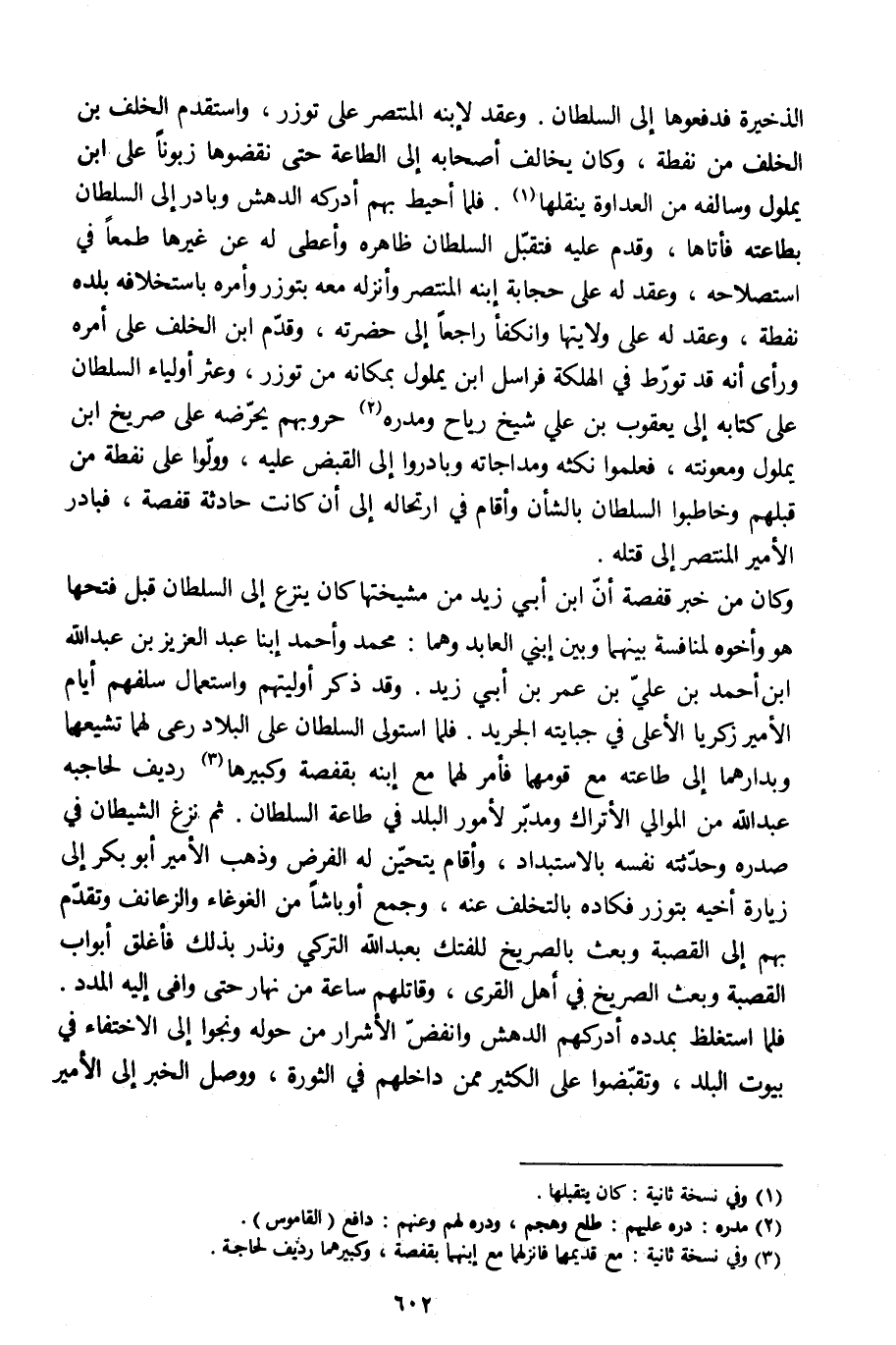 الذخيرة فدفعوها إلى السلطان. وعقد لابنه المنتصر على توزر، واستقدم الخلف بن الخلف من نفطة، وكان يخالف أصحابه إلى الطاعة حتى نقضوها زبونا على ابن يملول وسالفه من العداوة ينقلها [1] . فلما أحيط بهم أدركه الدهش وبادر إلى السلطان بطاعته فأتاها، وقدم عليه فتقبّل السلطان ظاهره وأعطى له عن غيرها طمعا في استصلاحه، وعقد له على حجابة ابنه المنتصر وأنزله معه بتوزر وأمره باستخلافه بلده نفطة، وعقد له على ولايتها وانكفأ راجعا إلى حضرته، وقدّم ابن الخلف على أمره ورأى أنه قد تورّط في الهلكة فراسل ابن يملول بمكانه من توزر، وعثر أولياء السلطان على كتابه إلى يعقوب بن علي شيخ رياح ومدرة [2] حروبهم يحرّضه على صريخ ابن يملول ومعونته، فعلموا نكثه ومداجاته وبادروا إلى القبض عليه، وولّوا على نفطة من قبلهم وخاطبوا السلطان بالشأن وأقام في ارتحاله إلى أن كانت حادثة قفصة، فبادر الأمير المنتصر إلى قتله.