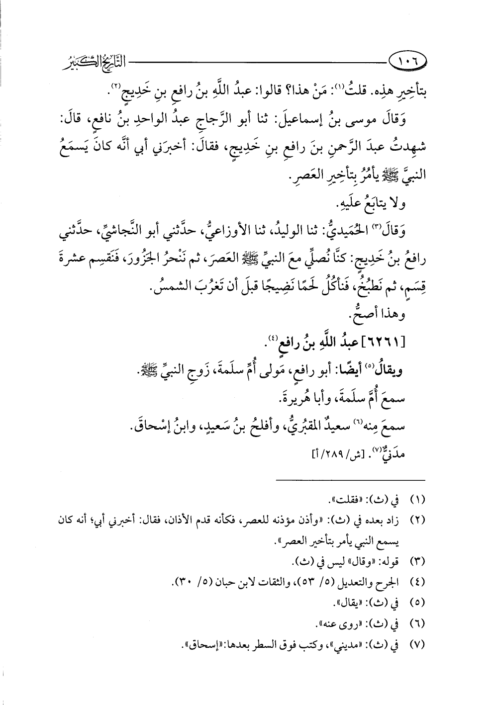 بتأخِيرِ هذِه. قلتُ (¬١): مَنْ هذا؟ قالوا: عبدُ اللَّهِ بنُ رافعِ بنِ خَدِيجٍ (¬٢).