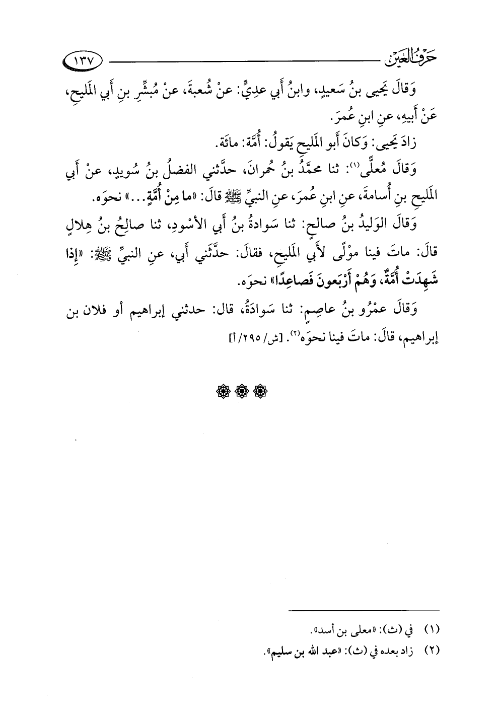 وَقالَ مُعلًّى (¬١): ثنا محمَّدُ بنُ حُمرانَ، حدَّثني الفضلُ بنُ سُويدٍ، عنْ أَبي المَليحِ بنِ أُسامةَ، عنِ ابنِ عُمرَ، عنِ النبيِّ -صلى اللَّه عليه وسلم- قالَ: "ما مِنْ أُمَّةٍ. . . " نحوَه.