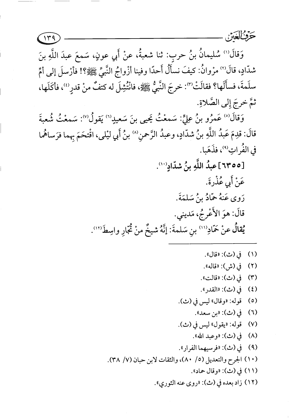 وَقالَ (¬٥) عَمرُو بنُ عَلِيٍّ: سَمعْتُ يَحيى بنَ سَعيدٍ (¬٦) يَقولُ (¬٧): سَمعْتُ شُعبةَ قالَ: قدِمَ عَبدُ اللَّهِ بنُ شدّادٍ، وعبدُ الرَّحمنِ (¬٨) بنُ أَبي ليْلى، اقْتحَمَ بِهما فرَساهُما في الفُراتِ (¬٩)، فذَهَبا.