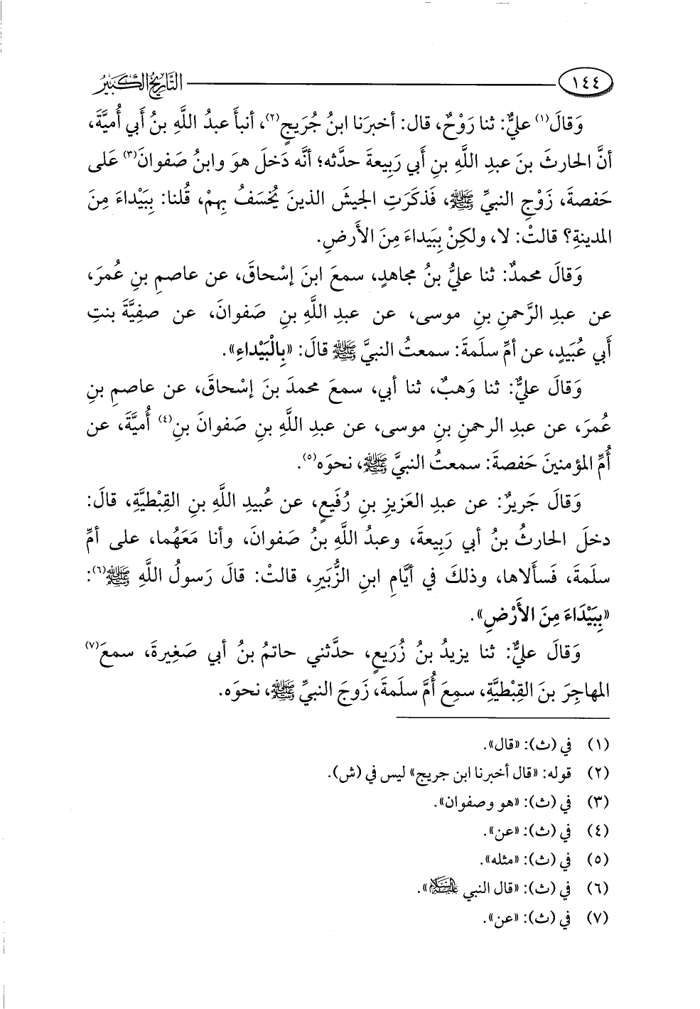 وَقالَ (¬١) عليٌّ: ثنا رَوْحٌ، قال: أخبرَنا ابنُ جُرَيجٍ (¬٢)، أنبأَ عبدُ اللَّهِ بنُ أَبي أُميَّةَ، أنَّ الحارثَ بنَ عبدِ اللَّهِ بنِ أَبي رَبِيعةَ حدَّثه؛ أنَّه دَخلَ هوَ وابنُ صَفوانَ (¬٣) عَلى حَفصةَ، زَوْجِ النبيِّ -صلى اللَّه عليه وسلم-، فَذكَرَتِ الجيشَ الذينَ يُخسَفُ بِهمْ، قُلنا: بِبَيْداءَ مِنَ المدينةِ؟ قالتْ: لا، ولكِنْ بِبَيداءَ مِنَ الأَرضِ.