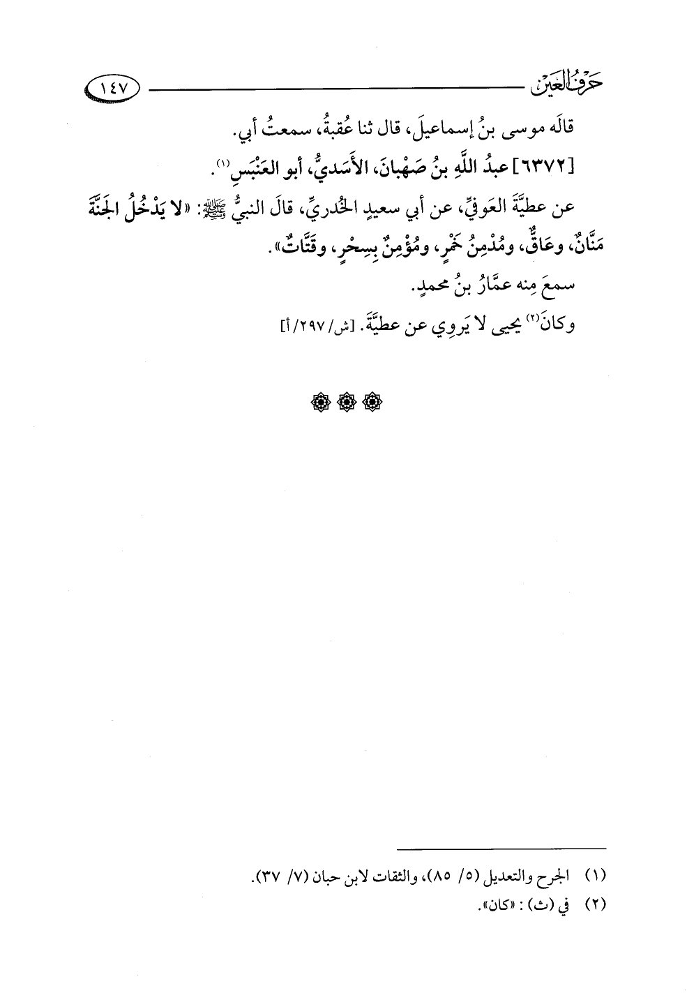 عن عطيَّةَ العَوفيِّ، عن أبي سعيدٍ الخُدريِّ، قالَ النبيُّ -صلى اللَّه عليه وسلم-: "لا يَدْخُلُ الجَنَّةَ مَنَّانٌ، وعَاقٌّ، ومُدْمِنُ خَمْرٍ، ومُؤْمِنٌ بِسِحْرٍ، وقَتَّاتٌ".