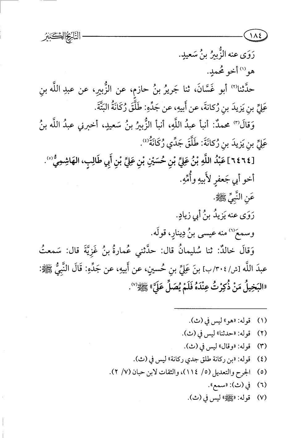 وَقالَ خالدٌ: ثنا سُليمانُ قال: حدَّثني عُمارةُ بنُ غَزِيَّةَ قال: سَمعتُ عبدَ اللَّه بنَ عَلِيِّ بنِ حُسينٍ، عن أَبيهِ، عن جَدِّهِ: قَالَ النَّبِيُّ -صلى اللَّه عليه وسلم-: "البَخِيلُ مَنْ ذُكرْتُ عِنْدَهُ فَلَمْ يُصَلِّ عَلَيَّ" -صلى اللَّه عليه وسلم- (¬٧).