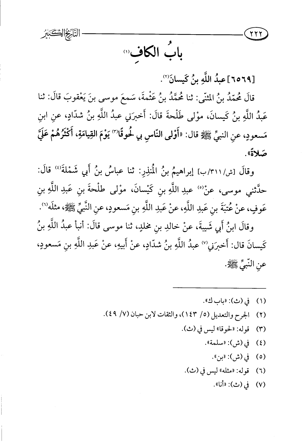 وقالَ ابنُ أَبي شَيبةَ، عنْ خالدِ بنِ مخلدٍ، ثنا موسى قالَ: أنبأ عبدُ اللَّهِ بنُ كَيسانَ قال: أَخبرَني (¬٧) عبدُ اللَّهِ بنُ شدّادٍ، عنْ أَبيهِ، عنْ عَبدِ اللَّهِ بنِ مَسعودٍ، عنِ النّبيِّ -صلى اللَّه عليه وسلم-.