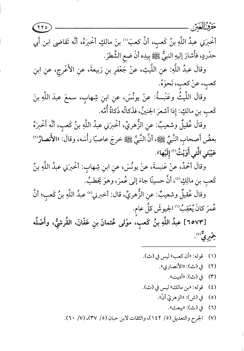 وقالَ عبدُ اللَّهِ: عنِ اللَّيثِ، عنْ جَعْفرِ بنِ رَبيعةَ، عنِ الأَعْرجِ، عنِ ابنِ كعبٍ، عنْ كعبٍ، نَحوَهُ.